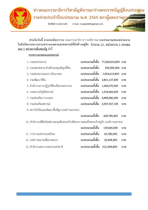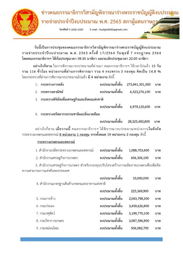 วันพุธที่ 7 กรกฎาคม 2564 เวลา 12.00 นาฬิกา ณ ห้องแถลงข่าว ชั้น 1 อาคารรัฐสภา น.ส.ธีรรัตน์ สำเร็จวาณิชย์ โฆษกคณะ กมธ.วิสามัญพิจารณาร่าง พ.ร.บ.งบประมาณรายจ่ายประจำปีงบประมาณ พ.ศ. 2565 แถลงข่าวเกี่ยวกับผลการประชุมและความคืบหน้าในการพิจารณาร่าง พ.ร.บ.งบประมาณรายจ่ายประจำปีงบประมาณ พ.ศ. 2565 โดยคณะ กมธ. ได้ใช้เวลาพิจารณาไปแล้ว 15 วัน รวม 116 ชั่วโมง มีหน่วยงานที่ผ่านการพิจารณารวม 4 กระทรวง ได้แก่ กระทรวงการคลัง กระทรวงพาณิชย์ กระทรวงดิจิทัลเพื่อเศรษฐกิจและสังคม และกระทรวงทรัพยากรธรรมชาติและสิ่งแวดล้อม และอีก 3 กองทุน คิดเป็นร้อยละ 14.8 ซึ่งเมื่อวานนี้ คณะ กมธ. ได้พิจารณางบประมาณของหน่วยงานในสังกัดกระทรวงเกษตรและสหกรณ์ 8 หน่วยงาน 1 กองทุน จากทั้งหมด 19 หน่วยงาน 2 กองทุน โดยในการพิจารณางบประมาณของกรมปศุสัตว์ที่ประชุมได้มีการหารือเกี่ยวกับสถานการณ์การระบาดของโรคลัมปีสกินที่กำลังระบาดอยู่ในขณะนี้ และการพิจารณางบประมาณของสำนักงานเศรษฐกิจการเกษตร ที่ประชุมได้หารือเกี่ยวกับการช่วยเหลือเกษตรกร เมื่อการใช้พลังงานของโลกเปลี่ยนแปลงไป สำหรับการพิจารณาในวันนี้ เป็นการพิจารณางบประมาณของหน่วยงานในสังกัดกระทรวงเกษตรและสหกรณ์ที่ยังค้างการพิจารณาอยู่ 11 หน่วยงาน 1 กองทุน และ 1 หน่วยงานอื่นของรัฐ
