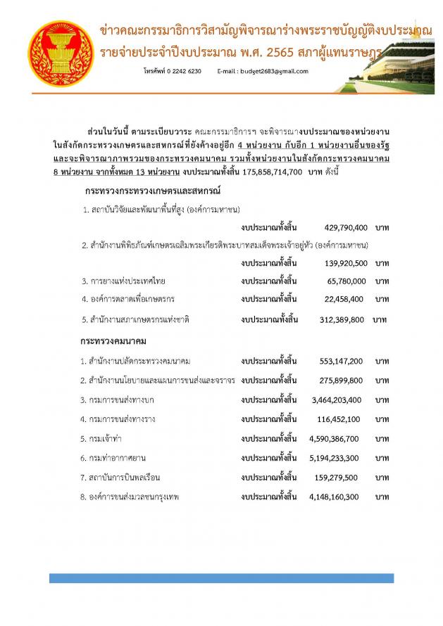วันพฤหัสบดีที่ 8 กรกฎาคม 2564 เวลา 14.00 นาฬิกา ณ ห้องแถลงข่าว ชั้น 1 อาคารรัฐสภา นายสุชาติ อุสาหะ และนายเรืองไกร ลีกิจวัฒนะ โฆษกคณะ กมธ.วิสามัญพิจารณาร่าง พ.ร.บ.งบประมาณรายจ่ายประจำปีงบประมาณ พ.ศ. 2565 แถลงข่าวเกี่ยวกับผลการประชุมและความคืบหน้าในการพิจารณาร่าง พ.ร.บ.งบประมาณฯ โดยคณะ กมธ. ได้ใช้เวลาพิจารณาไปแล้ว 16 วัน รวม 127 ชั่วโมง มีหน่วยงานที่ผ่านการพิจารณารวม 4 กระทรวง ได้แก่ กระทรวงการคลัง กระทรวงพาณิชย์ กระทรวงดิจิทัลเพื่อเศรษฐกิจและสังคม และกระทรวงทรัพยากรธรรมชาติและสิ่งแวดล้อม และอีก 3 กองทุน คิดเป็นร้อยละ 14.8 ซึ่งเมื่อวานนี้ คณะ กมธ. ได้พิจารณางบประมาณของหน่วยงานในสังกัดกระทรวงเกษตรและสหกรณ์ 7 หน่วยงาน 1 กองทุน โดยในการพิจารณางบประมาณของกรมฝนหลวงและการบินเกษตร ที่ประชุมได้มีการหารือเกี่ยวกับการลดฝุ่นควันพิษที่เกิดจากเหตุเพลิงไหม้โรงงานสารเคมีที่ จ.สมุทรปราการโดยการสร้างฝนเทียม สำหรับการพิจารณาในวันนี้ เป็นการพิจารณางบประมาณของหน่วยงานในสังกัดกระทรวงเกษตรและสหกรณ์ที่ยังค้างการพิจารณาอยู่อีก 4 หน่วยงาน และ 1 หน่วยงานอื่นของรัฐ รวมทั้งจะพิจารณาภาพรวมของกระทรวงคมนาคม และหน่วยงานในสังกัด