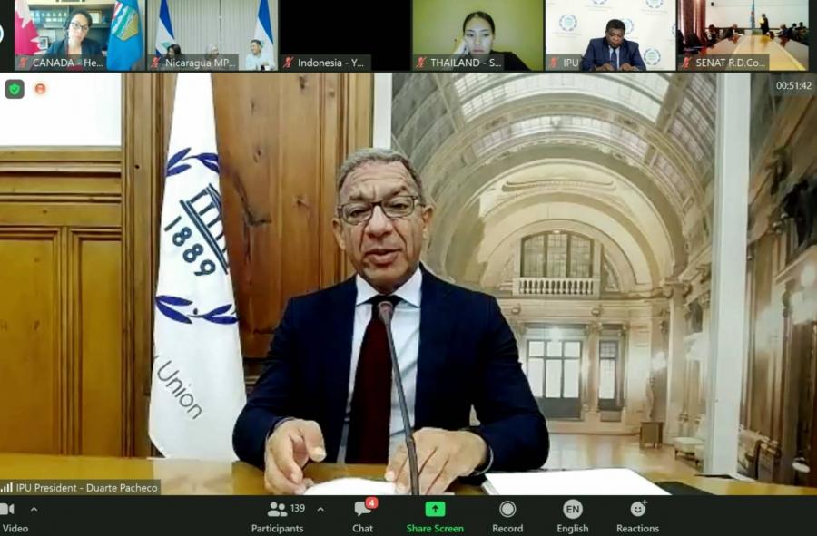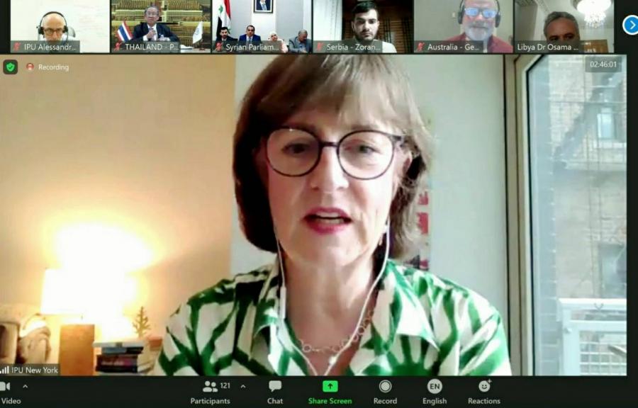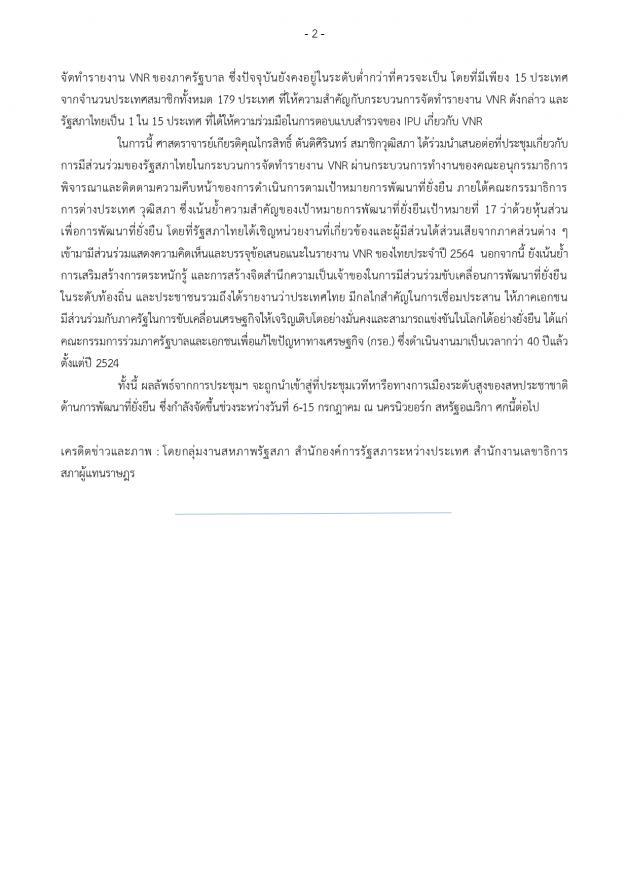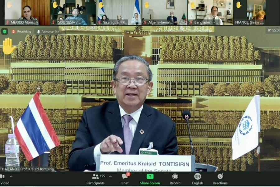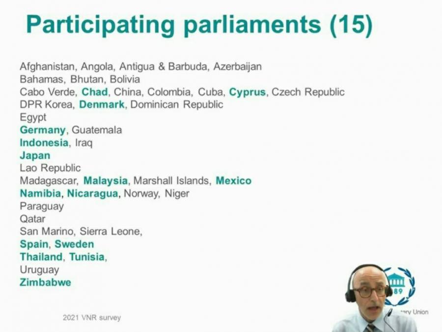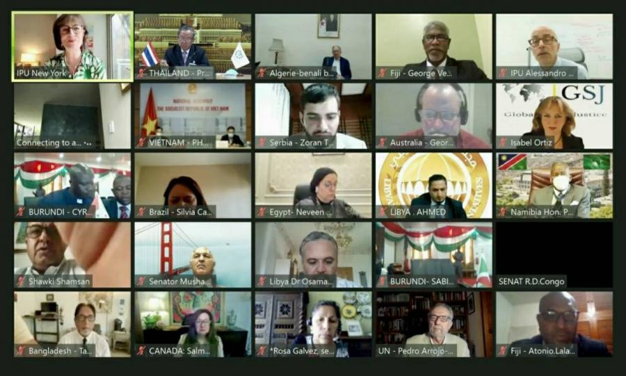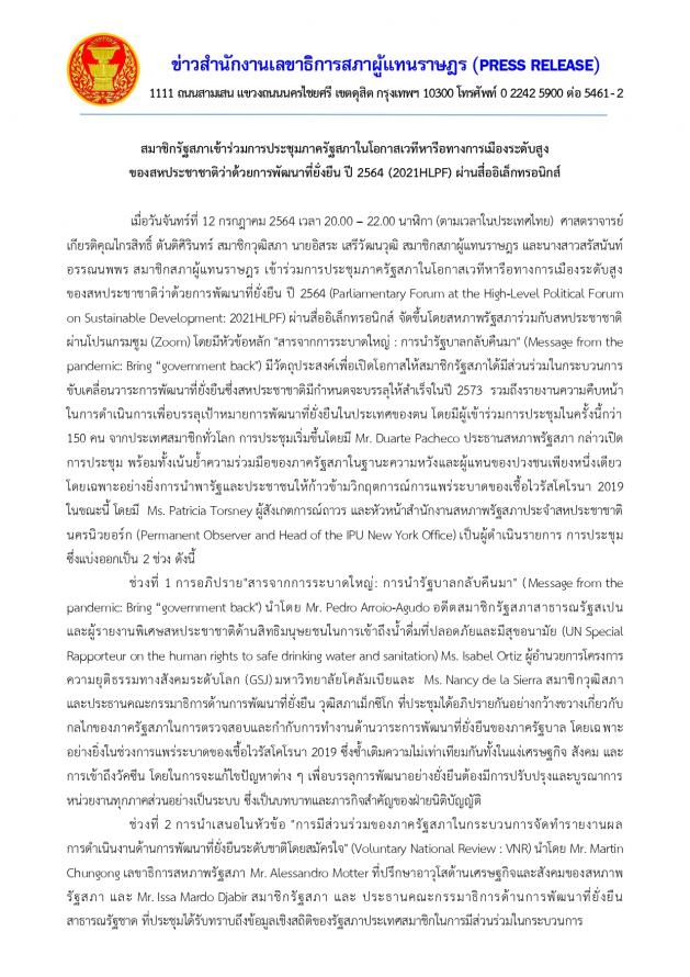สมาชิกรัฐสภาเข้าร่วมการประชุมภาครัฐสภาในโอกาสเวทีหารือทางการเมืองระดับสูงของสหประชาชาติว่าด้วยการพัฒนาที่ยั่งยืน ปี 2564 (2021HLPF) ผ่านสื่ออิเล็กทรอนิกส์