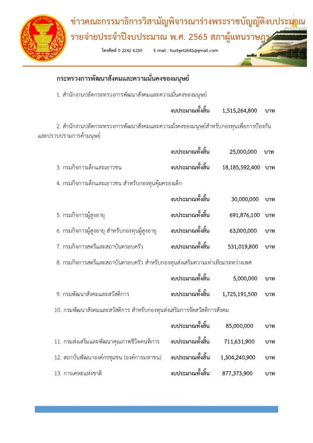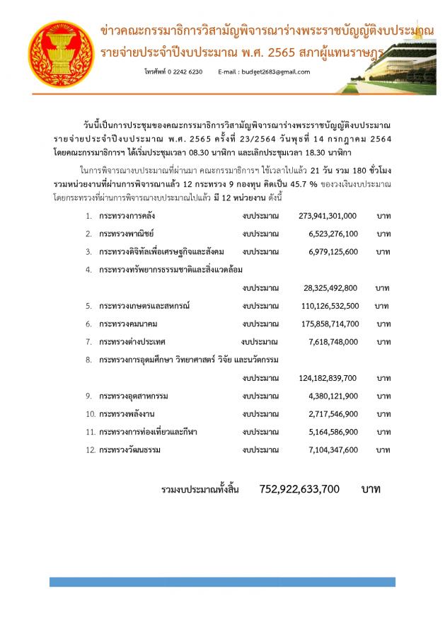 วันพุธที่ 14 กรกฎาคม 2564 เวลา 11.30 นาฬิกา ณ ห้องแถลงข่าว ชั้น 1 อาคารรัฐสภา นายเรืองไกร ลีกิจวัฒนะ โฆษกคณะ กมธ. วิสามัญพิจารณาร่างพระราชบัญญัติงบประมาณรายจ่ายประจำปีงบประมาณ พ.ศ. 2565 แถลงข่าวผลการประชุมของคณะ กมธ. ครั้งที่ 23/2564 โดยคณะ กมธ. ได้เริ่มประชุมเวลา 08.30 น. และเลิกประชุมเวลา 18.30 น. ในการพิจารณางบประมาณที่ผ่านมา คณะ กมธ. ใช้เวลาไปแล้ว 21 วัน รวม 180 ชั่วโมง รวมหน่วยงานที่ผ่านการพิจารณาแล้ว 12 กระทรวง 9 กองทุน คิดเป็นร้อยละ 45.7 ของวงเงินงบประมาณ โดยกระทรวงที่ผ่านการพิจารณางบประมาณไปแล้ว มี 12 หน่วยงาน ซึ่งเมื่อวาน (13 ก.ค.64) ได้พิจารณางบประมาณในภาพรวมของกระทรวงวัฒนธรรม และหน่วยงานในสังกัด ทั้งหมด 9 หน่วยงาน 4 กองทุน งบประมาณทั้งสิ้น 7,104,347,600 บาท และพิจารณางบประมาณในภาพรวมของกระทรวงสาธารณสุข และหน่วยงานในสังกัด ทั้งหมด 4 หน่วยงาน 1 กองทุน