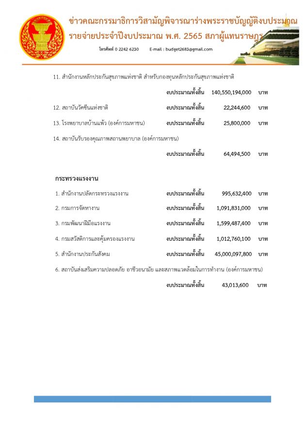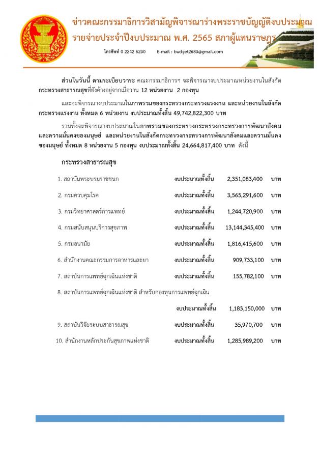 ส่วนในวันนี้ (14 ก.ค. 64) ตามระเบียบวาระจะพิจารณางบประมาณหน่วยงานในสังกัดกระทรวงสาธารณสุขที่ยังค้างอยู่จากเมื่อวาน 12 หน่วยงาน 2 กองทุน และจะพิจารณางบประมาณในภาพรวมของกระทรวงแรงงาน และหน่วยงานในสังกัด ทั้งหมด 6 หน่วยงาน งบประมาณทั้งสิ้น 49,742,822,300 บาท รวมทั้งจะพิจารณางบประมาณในภาพรวมของกระทรวงการพัฒนาสังคมและความมั่นคงของมนุษย์ และหน่วยงานในสังกัด ทั้งหมด 8 หน่วยงาน 5 กองทุน งบประมาณทั้งสิ้น 24,664,817,400 บาท