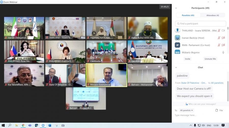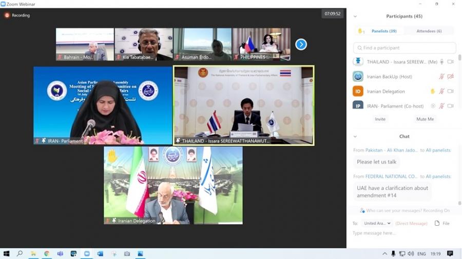 เมื่อวันพุธที่ 14 กรกฎาคม 2564 เวลา 14.0019.30 นาฬิกา ผู้แทนรัฐสภาไทยในสมัชชารัฐสภาเอเชีย (Asian Parliamentary Assembly : APA) นำโดย นายอิสระ เสรีวัฒนวุฒิ สมาชิกสภาผู้แทนราษฎร ในฐานะคณะผู้แทนรัฐสภาไทย พร้อมด้วย นายคุณวุฒิ ตันตระกูล รองเลขาธิการสภาผู้แทนราษฎร และนางบุณฑริกา ชุณหะนันทน์ ผู้อำนายการสำนักองค์การรัฐสภาระหว่างประเทศ เข้าร่วมการประชุมคณะ กมธ.ว่าด้วยสังคมและวัฒนธรรมของสมัชชารัฐสภาเอเชียในรูปแบบการประชุมผ่านสื่ออิเล็กทรอนิกส์ จัดโดยรัฐสภาสาธารณรัฐอิสลามอิหร่าน ซึ่งการประชุมดังกล่าว มีนาง Masoumeh Pashaee Bahram หัวหน้าคณะผู้แทนรัฐสภาสาธารณรัฐอิสลามอิหร่านใน APA ทำหน้าที่ประธานการประชุม โดยมีสมาชิกเข้าร่วมประชุมฯ กว่า 24 ประเทศ