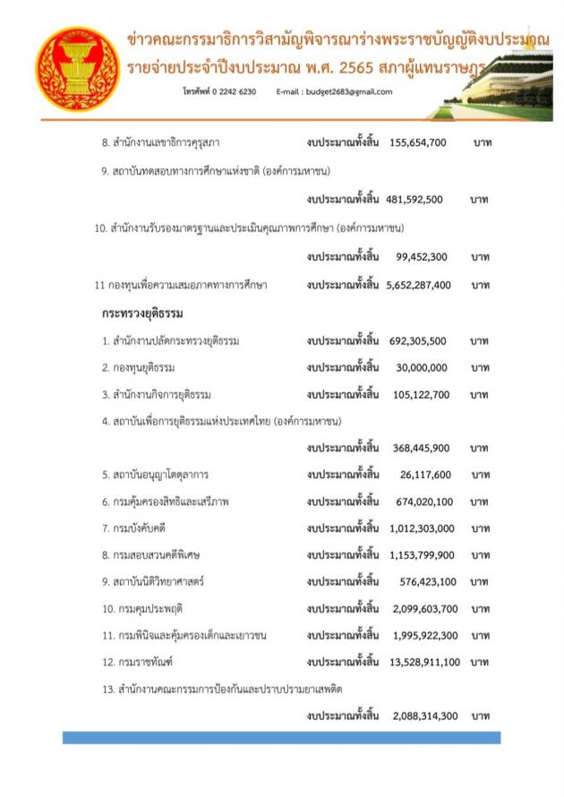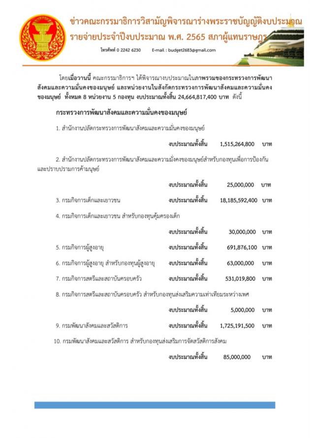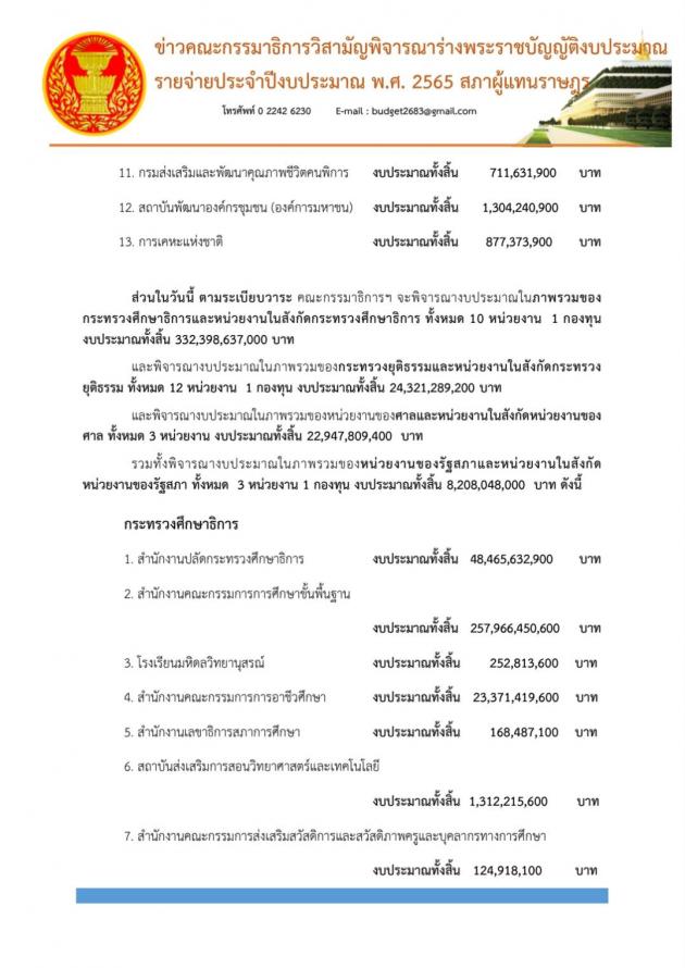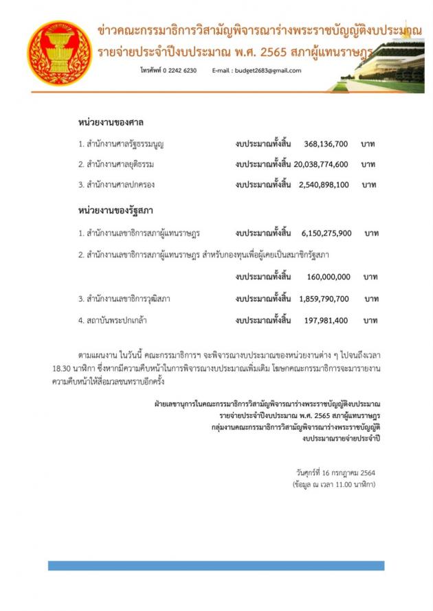 วันศุกร์ที่ 16 กรกฎาคม 2564 เวลา 11.30 นาฬิกา ณ ห้องแถลงข่าว ชั้น 1 อาคารรัฐสภา นายสรวุฒิ เนื่องจำนงค์ โฆษกคณะ กมธ.วิสามัญพิจารณาร่าง พ.ร.บ.งบประมาณรายจ่ายประจำปีงบประมาณ พ.ศ. 2565 และคณะ แถลงข่าวผลการประชุมและความคืบหน้าในการพิจารณาร่าง พ.ร.บ.งบประมาณรายจ่ายประจำปีงบประมาณ พ.ศ. 2565 ว่าในการพิจารณางบประมาณที่ผ่านมา คณะ กมธ. ใช้เวลาไปแล้ว 23 วันรวม 200 ชั่วโมง รวมหน่วยงานที่พิจารณาแล้ว 16 กระทรวง 16 กองทุน คิดเป็นร้อยละ 60.5 ของวงเงินงบประมาณทั้งหมด โดยในวันนี้ตามระเบียบวาระ คณะ กมธ.จะพิจารณา งบประมาณในภาพรวมของกระทรวงศึกษาและหน่วยงานในสังกัด กระทรวงยุติธรรมและหน่วยงานในสังกัด และพิจารณางบประมาณ ในภาพรวมของหน่วยงานของศาลและหน่วยงานในสังกัด รวมทั้งพิจารณางบประมาณในภาพรวมของหน่วยงานของรัฐสภาและหน่วยงานในสังกัด