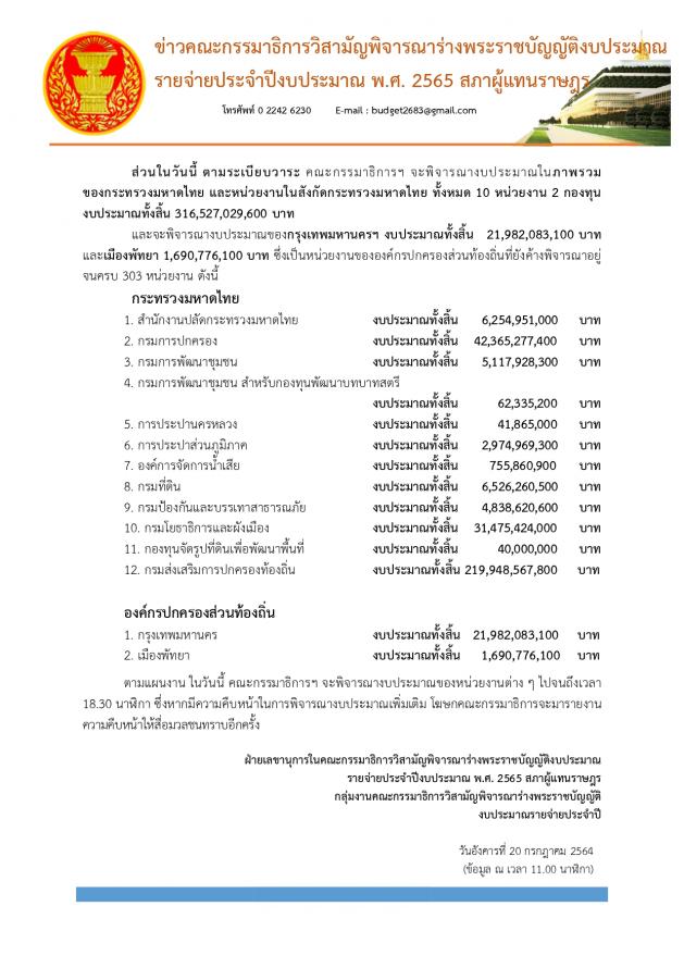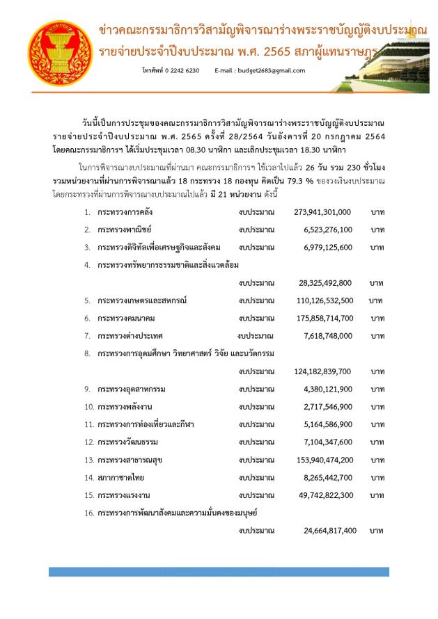 วันอังคารที่ 20 กรกฎาคม 2564 เวลา 13.30 นาฬิกา ณ จุดให้สัมภาษณ์ ชั้น 1 อาคารรัฐสภา นายสาคร เกี่ยวข้อง นายสุชาติ อุสาหะ และนายเรืองไกร เรืองกิจวัฒนะ โฆษกคณะ กมธ.พิจารณาร่าง พ.ร.บ.งบประมาณรายจ่ายประจำปีงบประมาณ พ.ศ.2565 ร่วมกันแถลงข่าวผลการประชุมคณะ กมธ. ครั้งที่ 28/2564 โดยคณะกรรมาธิการฯ ได้เริ่มประชุมเวลา 08.30 นาฬิกา และเลิกประชุมเวลา 18.30 นาฬิกา ในการพิจารณางบประมาณที่ผ่านมา คณะกรรมาธิการฯ ใช้เวลาไปแล้ว 26 วัน รวม 230 ชั่วโมง รวมหน่วยงานที่ผ่านการพิจารณาแล้ว 18 กระทรวง 18 กองทุน คิดเป็น 79.3 %6 ของวงเงินงบประมาณ