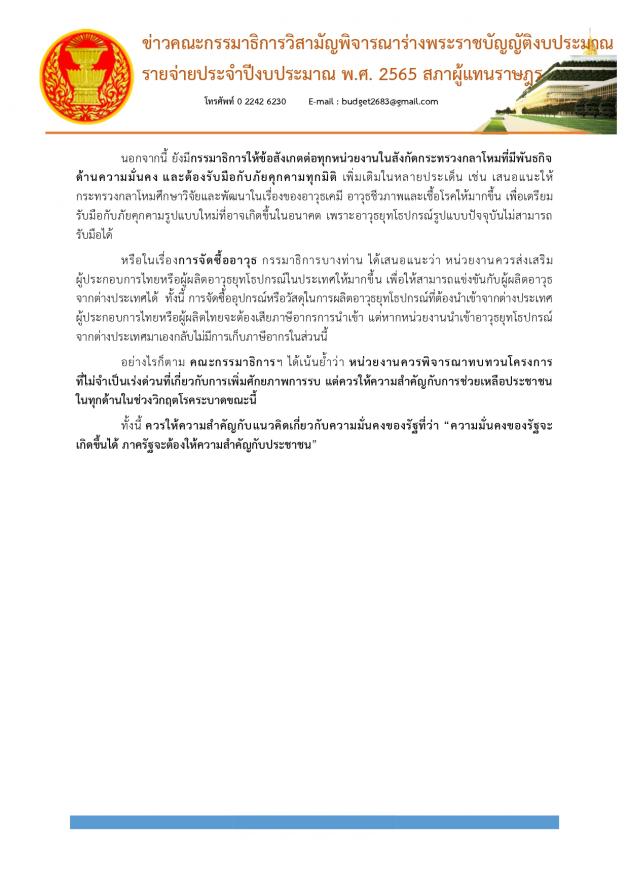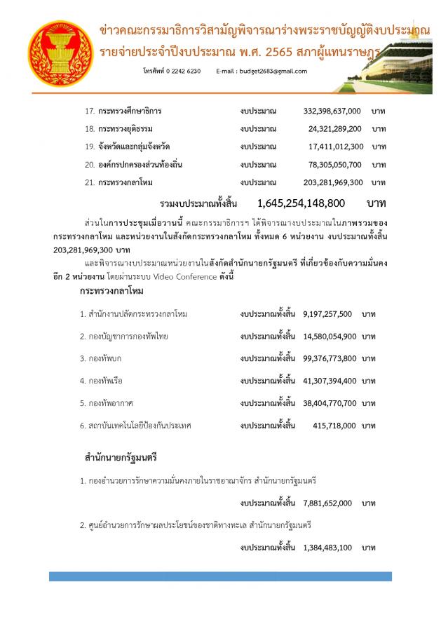 ส่วนในการประชุมเมื่อวานนี้ คณะกรรมาธิการฯ ได้พิจารณางบประมาณในภาพรวมของกระทรวงกลาโหม และหน่วยงานในสังกัดกระทรวงกลาโหม ทั้งหมด 6 หน่วยงาน งบประมาณทั้งสิ้น 203,281,969,300 บาทและพิจารณางบประมาณหน่วยงานในสังกัดสำนักนายกรัฐมนตรี ที่เกี่ยวข้องกับความมั่นคงอีก 2 หน่วยงาน โดยผ่านระบบ Video Conference คือ กระทรวงกลาโหม และสำนักนายกรัฐมนตรี โดยในการพิจารณาภาพรวมงบประมาณของ "กระทรวงกลาโหม" ที่ประชุมได้มีการหารือกันเกี่ยวกับสถานการณ์การระบาดของโรคติดเชื้อไวรัสโคโรนา 2019 ในประเทศซึ่งมีความรุนแรงขึ้นอย่างต่อเนื่อง ทั้งนี้ มีกรรมาธิการบางท่านให้ ข้อเสนอแนะว่า หน่วยงานควรให้บุคลากรทางการแพทย์ของหน่วยงานช่วยเหลือประชาชนและสนับสนุนรัฐบาลในการแก้ปัญหาการระบาดของโรคติดเชื้อไวรัสโคโรนา 2019 และปัญหาด้านสาธารณสุขอื่น ๆ