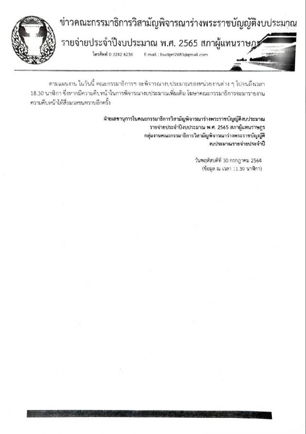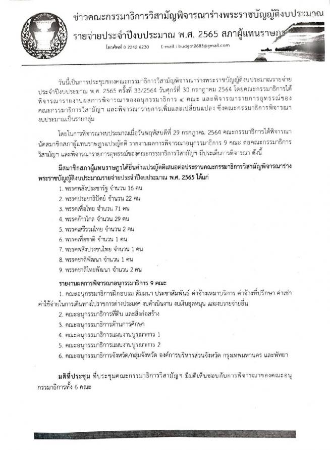วันศุกร์ที่ 30 กรกฎาคม 2564 เวลา 11.10 นาฬิกา ณ จุดให้สัมภาษณ์ ชั้น 1 อาคารรัฐสภา นายเรืองไกร ลีกิจวัฒนะ โฆษกคณะ กมธ. วิสามัญพิจารณาร่างพระราชบัญญัติงบประมาณรายจ่ายประจำปีงบประมาณ พ.ศ. 2565 แถลงข่าวผลการประชุมของคณะ กมธ. ครั้งที่ 33/2564 โดยคณะ กมธ.ได้พิจารณานัดสมาชิกสภาผู้แทนราษฎรแปรญัตติ รายงานผลการพิจารณาอนุ กมธ. 9 คณะ ต่อคณะ กมธ.สามัญฯ และพิจารณารายการอุทธรณ์ของคณะ กมธ.วิสามัญฯ โดยมีประเด็นการพิจารณา คือสมาชิกสภาผู้แทนราษฎร ได้ยื่นคำแปรญัตติเสนอต่อประธานคณะ กมธ.