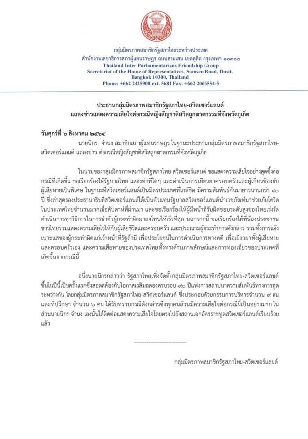วันศุกร์ที่ 6 สิงหาคม 2564 เวลา 11.00 นาฬิกา ณ จุดให้สัมภาษณ์ ชั้น 1 อาคารรัฐสภา นายนิกร จำนง ส.ส.พรรคชาติไทยพัฒนา ในฐานะประธานกลุ่มมิตรภาพสมาชิกรัฐสภาไทย-สวิตเซอร์แลนด์ แถลงข่าวกรณีหญิงสัญชาติสวิสถูกฆาตกรรมที่ จ.ภูเก็ต ในนามของกลุ่มมิตรภาพสมาชิกรัฐสภาไทย-สวิตเซอร์แลนด์ ขอแสดงความเสียใจอย่างสุดซึ้งต่อกรณีที่เกิดขึ้น และขอเรียกร้องให้รัฐบาลไทยแสดงท่าทีใด ๆ และดำเนินการเยียวยาครอบครัวและผู้ที่เกี่ยวข้องกับผู้เสียหายเป็นพิเศษ ในฐานะที่สวิตเซอร์แลนด์เป็นมิตรประเทศที่ใกล้ชิด มีความสัมพันธ์กับประเทศไทยมาอย่างยาวนานกว่า 90 ปี ซึ่งเมื่อสัปดาห์ที่ผ่านมา รองประธานาธิบดีสวิตเซอร์แลนด์ ได้เป็นตัวแทนรัฐบาลสวิตเซอร์แลนด์นำเวชภัณฑ์มาช่วยภัยโควิด-19 ในประเทศไทยจำนวนมาก และขอเรียกร้องให้ผู้ที่มีหน้าที่รับผิดชอบระดับสูงของไทย เร่งรัดดำเนินการทุกวิถีทาง ในการนำตัวผู้กระทำความผิดมาลงโทษให้เร็วที่สุด