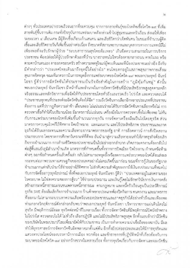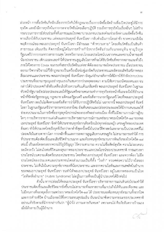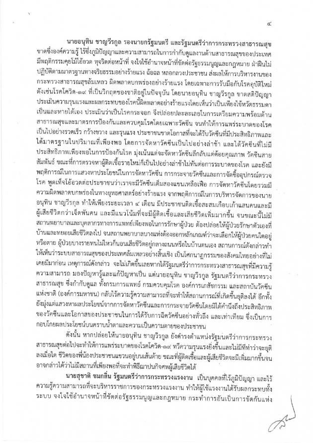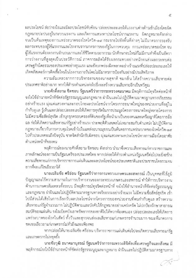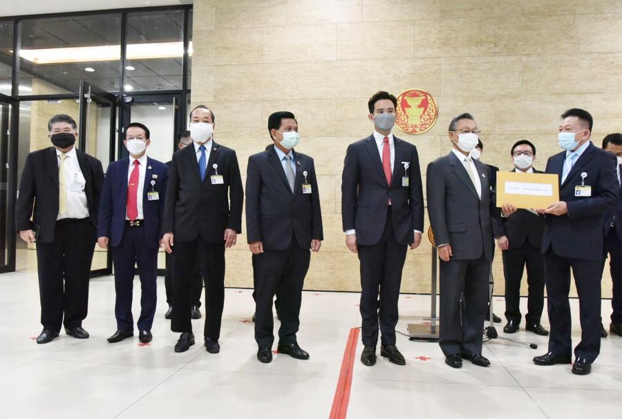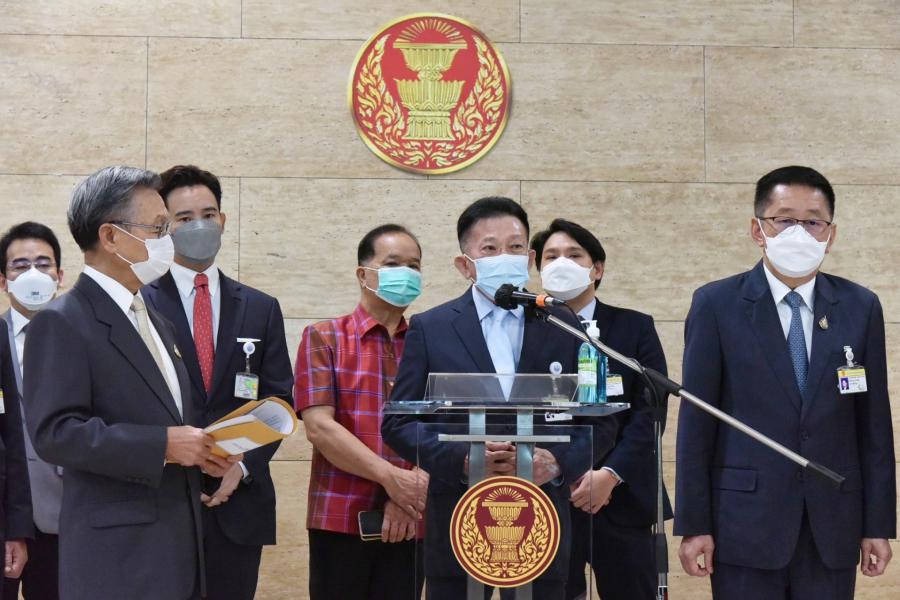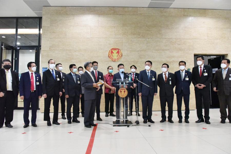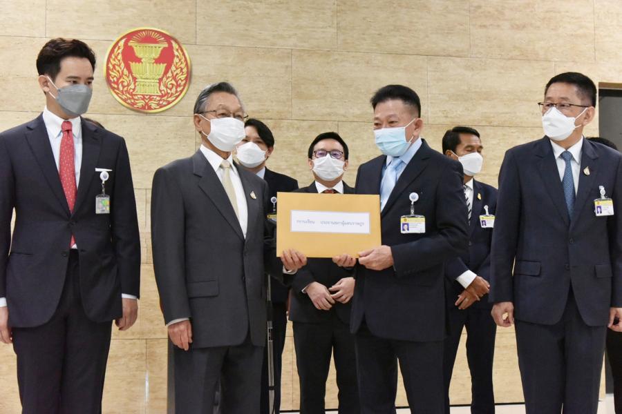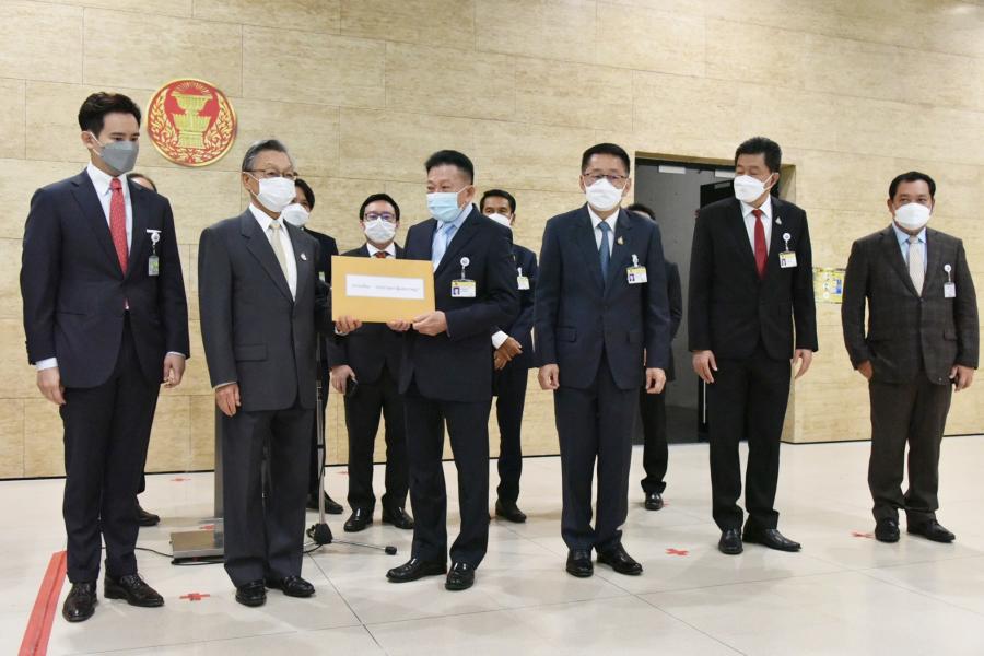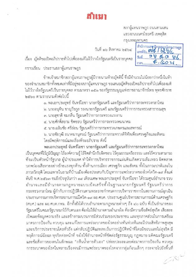 | วันจันทร์ที่ 16 สิงหาคม 2564 เวลา 09.45 นาฬิกา ณ จุดให้สัมภาษณ์ ชั้น 1 อาคารรัฐสภา นายชวน หลีกภัย ประธานสภาผู้แทนราษฎร รับยื่นญัตติขอเปิดอภิปรายทั่วไปเพื่อลงมติไม่ไว้วางใจรัฐมนตรีเป็นรายบุคคล จำนวน 6 คน ประกอบด้วย 1. พล.อ.ประยุทธ์ จันทร์โอชา นายกรัฐมนตรีและ รมว.กลาโหม 2. นายอนุทิน ชาญวีรกูล รองนายกรัฐมนตรีและ รมว.สาธารณสุข 3. นายสุชาติ ชมกลิ่น รมว.แรงงาน 4. นายศักดิ์สยาม ชิดชอบ รมว.คมนาคม 5. นายเฉลิมชัย ศรีอ่อน รมว.เกษตรและสหกรณ์ 6. นายชัยวุฒิ ธนาคมานุสรณ์ รมว.ดิจิทัลเพื่อเศรษฐกิจและสังคม จากนายสมพงษ์ อมรวิวัฒน์ ผู้นำฝ่ายค้านในสภาผู้แทนราษฎร พร้อมด้วยตัวแทนพรรคการเมืองฝ่ายค้าน ประกอบด้วย พรรคเพื่อไทย พรรคก้าวไกล พรรคเสรีรวมไทย พรรคประชาชาติ พรรคเพื่อชาติ และพรรคพลังปวงชนไทย โดยพรรคฝ่ายค้าน ได้พิจารณาหารือร่วมกันถึงความบกพร่องของรัฐบาลที่ได้บริหารราชการมาในระยะเวลา 1 ปีที่ผ่านมา ทั้งเรื่องการบริหารวัคซีน การบริหารสถานการณ์โรคโควิด- 19 และด้านเศรษฐกิจ จึงจำเป็นอย่างยิ่งที่จะต้องยื่นญัตติขอเปิดอภิปรายทั่วไปเพื่อลงมติไม่ไว้วางใจรัฐมนตรีเป็นรายบุคคล และขอให้ประธานสภาผู้แทนราษฎร ตรวจสอบญัตติและบรรจุเข้าสู่ระเบียบวาระการประชุมเป็นเรื่องด่วนต่อไป