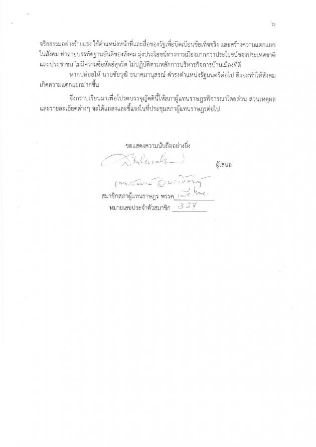 ด้านนายชวน หลีกภัย กล่าวว่า กระบวนการต่อจากนี้จะให้เจ้าหน้าที่ดำเนินการตรวจสอบความถูกต้องของญัตติภายใน 7 วัน ซึ่งโดยข้อบังคับการประชุมฯ แล้วจะต้องบรรจุเข้าสู่ระเบียบวาระการประชุมเป็นเรื่องด่วน โดยทางปฏิบัตินั้นจะต้องแจ้งให้นายกรัฐมนตรีทราบและหารือกับตัวแทนฝ่ายรัฐบาลว่าจะเห็นสมควรอภิปรายในช่วงเวลาใด ทั้งนี้ การเสนอญัตติในครั้งนี้นับเป็นครั้งที่ 3 ของการเสนอญัตติอภิปรายไม่ไว้วางใจ โดย 2 ครั้งแรกเป็นการเสนอในช่วงเดือน ม.ค. ในสมัยประชุมที่สองของปีนั้น และอภิปรายในเดือน ก.พ. แต่ครั้งนี้เป็นการอภิปรายในสมัยประชุมแรกของปีนี้ ซึ่งผลทางกฎหมายหลังจากที่มีการยื่นญัตติแล้วจะยุบสภาในช่วงเวลานี้ไม่ได้ ยกเว้นหากมีการถอนญัตติหรือลงมติไปแล้ว โดยการอภิปรายไม่ไว้วางใจ ตามกฎหมายแล้วสามารถเสนอได้เพียงครั้งเดียวในสมัยประชุม แต่สามารถเสนอให้มีการอภิปรายเพื่อขอคำชี้แจง ซักถาม และให้คำแนะนำ โดยไม่มีการลงมติได้