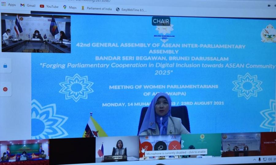 วันจันทร์ที่ 23 สิงหาคม 2564 เวลา 16.00 - 18.00 นาฬิกา ณ ห้องประชุม 406 ชั้น 4 อาคารรัฐสภา นางพิกุลแก้ว ไกรฤกษ์ สมาชิกวุฒิสภา ในฐานะหัวหน้าคณะผู้แทนรัฐสภาไทย ในการประชุมคณะ กมธ. ด้านสมาชิกรัฐสภาสตรี ในการประชุมใหญ่สมัชชารัฐสภาอาเซียน ครั้งที่ 42 พร้อมด้วย น.ส.เพชรชมพู กิจบูรณะ สมาชิกสภาผู้แทนราษฎร ในฐานะผู้แทนรัฐสภาไทย เข้าร่วมประชุมคณะ กมธ. ด้านสมาชิกรัฐสภาสตรี (WAIPA) ในการประชุมใหญ่สมัชชารัฐสภาอาเซียน ครั้งที่ 42