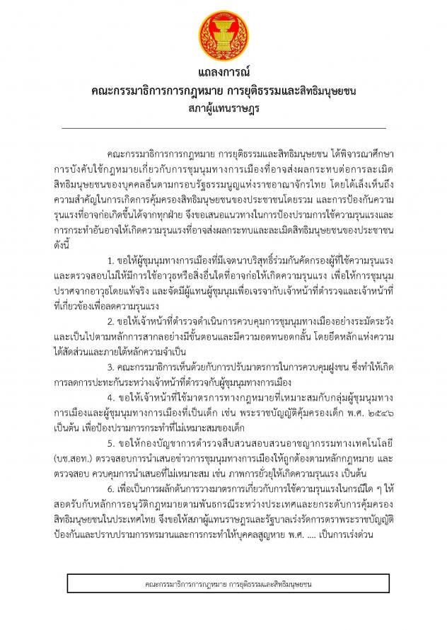 กมธ. การกฎหมาย การยุติธรรม และสิทธิมนุษยชน และ เลขานุการคณะ กมธ. ร่วมกันแถลงข่าวถึงแนวทางในการป้องปรามการใช้ความรุนแรงและการกระทำอันอาจให้เกิดความรุนแรงที่อาจส่งผลกระทบและละเมิดสิทธิมนุษยชนของประชาชน