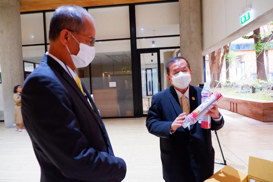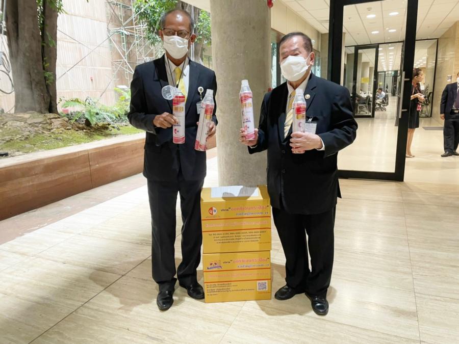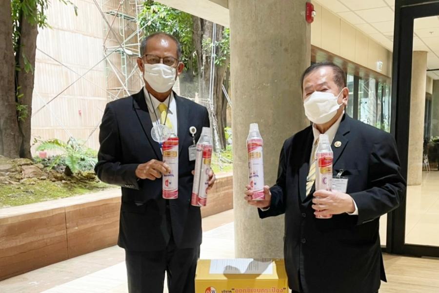 นายสมบูรณ์ อุทัยเวียนกุล เลขานุการประธานสภาผู้แทนราษฎร รับมอบออกซิเจนกระป๋องช่วยชีวิตผู้ป่วยหนักโควิด-19 จากนายประเสริฐ ประคุณศึกษาพันธ์ อดีตสมาชิกวุฒิสภา