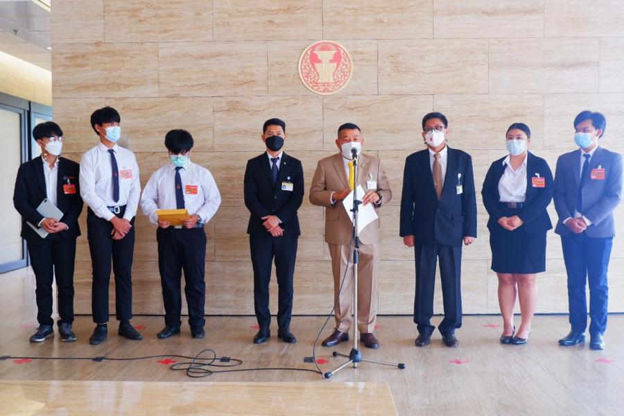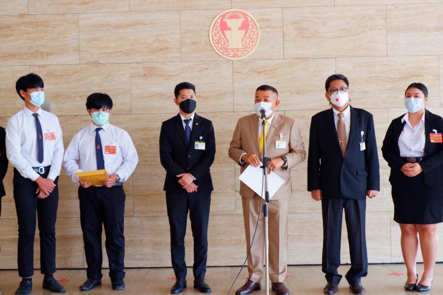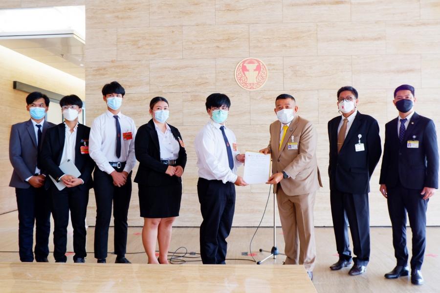 นายครูมานิตย์ สังข์พุ่ม รองประธานคณะ กมธ. การตำรวจ คนที่หนึ่ง พร้อมด้วย นายวิสุทธิ์ ไชยณรุณ ที่ปรึกษาคณะ กมธ. และนายภาควัต ศรีสุรพล ส.ส. พรรคเพื่อไทย รับยื่นหนังสือจากนายมงคล คำคนซื่อ นายกองค์การนักศึกษามหาวิทยาลัยขอนแก่น เรื่อง ขอให้เปิดพื้นที่ในการหารือพูดคุยเพื่อแสวงหาทางออกจากวิกฤตทางการเมือง