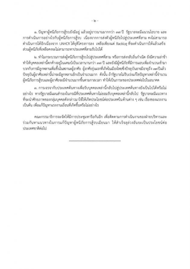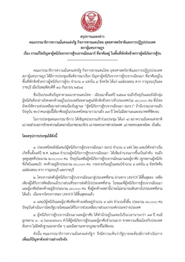 วันศุกร์ที่ 17 กันยายน 2564 เวลา 10.35 นาฬิกา ณ ห้องแถลงข่าว ชั้น 1 อาคารรัฐสภา นายมนูญ สิวาภิรมย์รัตน์ ประธานคณะ กมธ. ความมั่นคงแห่งรัฐ กิจการชายแดนไทย ยุทธศาสตร์ชาติและการปฏิรูปประเทศ และคณะ แถลงข่าวเกี่ยวกับผลการประชุมคณะกมธ. ในประเด็นการแก้ไขปัญหาผู้หนีภัยจากการสู้รบจากเมียนมาที่อาศัยอยู่ในพื้นที่พักพิงชั่วคราวผู้หนีภัยการสู้รบ ซึ่งที่ประชุมมีความเห็นว่ารัฐบาลจะต้องมีการดำเนินการ เพื่อแก้ปัญหาดังกล่าวอย่างจริงจัง และต้องมีแนวนโยบาย รวมทั้งการดำเนินการกับผู้หนีภัยจากการสู้รบ เนื่องจากการส่งตัวผู้หนีภัยไปสู่ประเทศที่สาม คงไม่สามารถดำเนินการได้อีกเนื่องจากสำนักงานข้าหลวงใหญ่ผู้ลี้ภัยแห่งสหประชาชาติ หรือ UNHCR ได้ยุติโครงการลง ซึ่งกระบวนการส่งผู้หนีภัยจากการสู้รบไปสู่ประเทศที่สาม หรือการส่งกลับถิ่นกำเนิดนั้นจะต้องดำเนินการให้รวดเร็วขึ้น เพื่อมิให้เกิดปัญหาบุคคลตกค้าง ดังนั้น หากรัฐบาลไม่รีบเร่งแก้ไขปัญหาเหล่านี้ จำนวนผู้หนีภัยจากการสู้รบและผู้อาศัยจะมีจำนวนมากขึ้นตามกาลเวลา ทำให้เป็นภาระของประเทศในอนาคต จึงควรมีการเจรจากับประเทศต้นทางเพื่อรับบุคคลเหล่านี้กลับไปสู่ประเทศต้นทาง ในกรณีที่ประเทศต้นทางไม่ยอมรับบุคคลเหล่านี้กลับรัฐบาลจะมีแผนสำรองอย่างไร รวมถึงรัฐบาลจะต้องมีแนวทางที่จะนำศักยภาพของกลุ่มบุคคลดังกล่าวมาใช้ให้เกิดประโยชน์ต่อประเทศในด้านต่าง ๆ เพื่อแก้ปัญหาแรงงานเถื่อนที่เกิดขึ้น ทั้งนี้ คณะ กมธ. จะจัดให้มีการประชุมหารือร่วมกัน เพื่อติดตามการดำเนินงานของฝ่ายบริหารและร่วมกันหาแนวทางในการแก้ปัญหาผู้หนีภัยจากการสู้รบจากเมียนมาให้สำเร็จลุล่วงอันจะเป็นประโยชน์ต่อประเทศชาติต่อไป