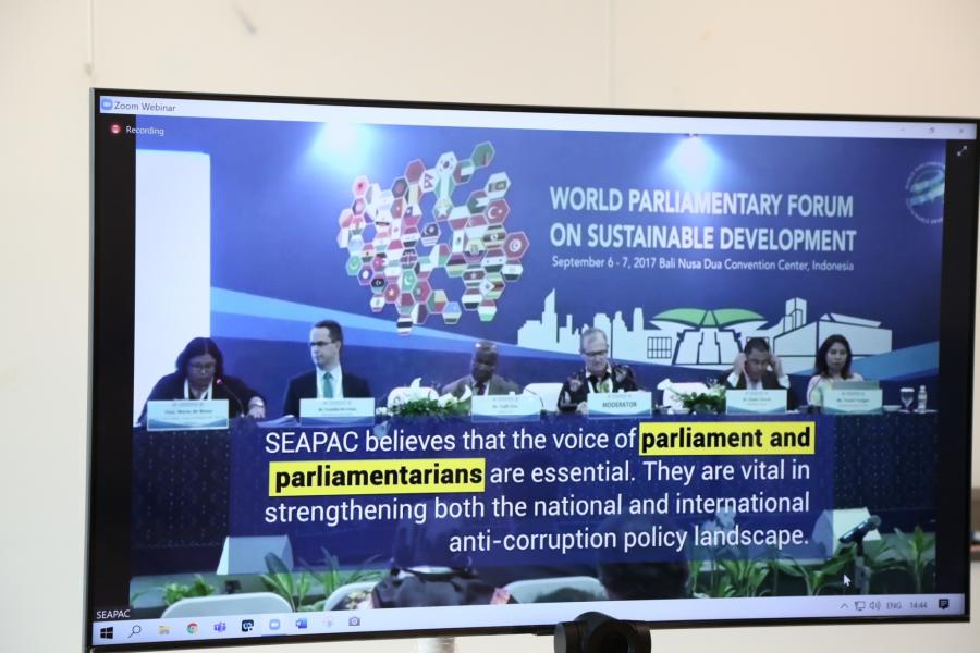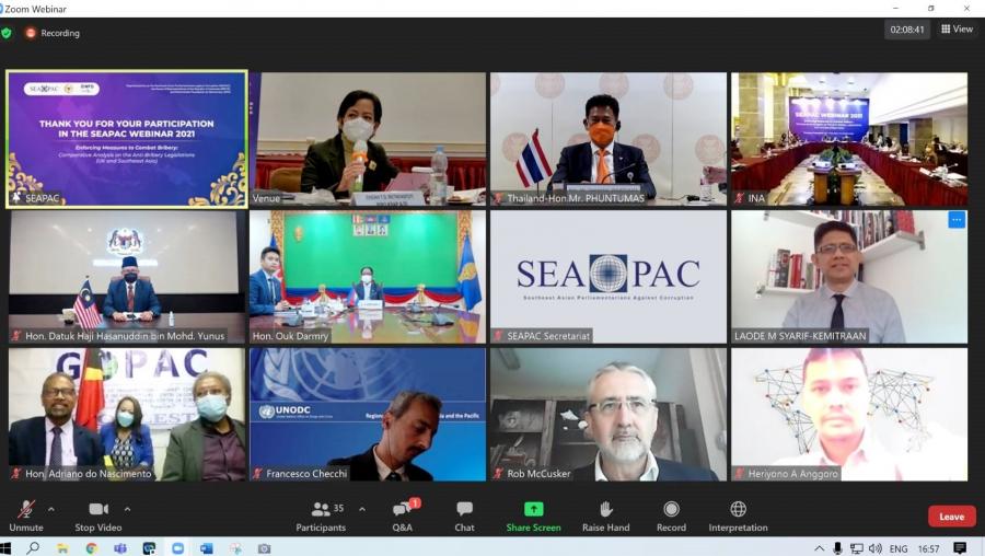คณะผู้แทนรัฐสภาไทย ประกอบด้วย เข้าร่วมการสัมมนาผ่านสื่ออิเล็กทรอนิกส์ของกลุ่มสมาชิกรัฐสภาภูมิภาคเอเชียตะวันออกเฉียงใต้เพื่อการต่อต้านการทุจริตในหัวข้อ “การบังคับใช้มาตรการเพื่อขจัดการติดสินบน : การวิเคราะห์เชิงเปรียบเทียบกฎหมายว่าด้วยการต่อต้านการติดสินบน (สหราชอาณาจักรและเอเชียตะวันออกเฉียงใต้)”