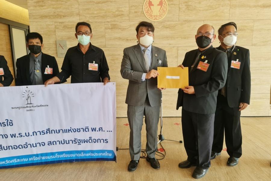 นายสิริพงศ์ อังคสกุลเกียรติ ส.ส. พรรคภูมิใจไทย รับยื่นหนังสือจาก นายอุดม โพธิ์ชัย ประธานชมรมครูประถมศึกษา จ.ศรีสะเกษ และคณะ