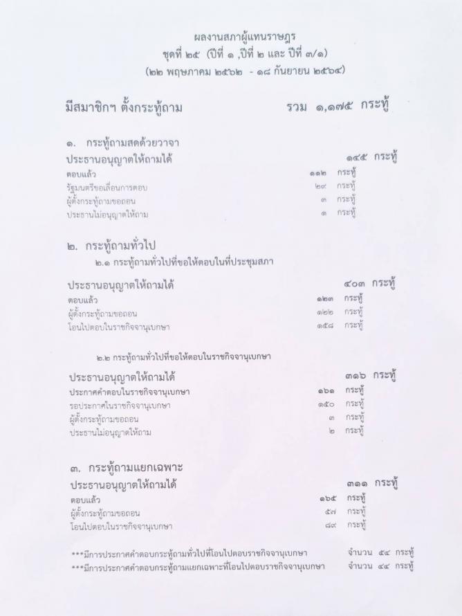 วันอังคารที่ 9 พฤศจิกายน 2564 เวลา 11.20 นาฬิกา ณ ห้องแถลงข่าว ชั้น 1 อาคารรัฐสภา นพ.สุกิจ อัถโถปกรณ์ ที่ปรึกษาประธานสภาผู้แทนราษฎร แถลงข่าว กรณีที่มีการวิพากวิจารณ์ถึงการตอบกระทู้ในการประชุมสภาผู้แทนราษฎรว่า มีการตอบกระทู้น้อยมาก จึงขอชี้แจงว่าไม่เป็นความจริง เพราะตั้งแต่การเปิดสมัยประชุมปีที่ 1 (22 พ.ค. 62) จนถึงสมัยสามัญประจำปีครั้งที่หนึ่ง ปีที่ 3 (18 ก.ย. 64) มีการตั้งกระทู้ถามจำนวนทั้งสิ้น 1,175 กระทู้ มีการตอบกระทู้ถามสดด้วยวาจา 112 กระทู้ กระทู้ถามทั่วไป 123 กระทู้ กระทู้ถามแยกเฉพาะ 165 กระทู้ รวมทั้งมีการตอบในราชกิจจานุเบกษา ซึ่งแสดงให้เห็นว่าคณะรัฐมนตรีให้ความร่วมมือในการตอบกระทู้เป็นอย่างดี โดยเหตุการณ์ในสัปดาห์ที่แล้วที่มีรัฐมนตรีมาตอบเพียงท่านเดียวนั้น เนื่องจากมีการเปลี่ยนแปลงวันประชุมของคณะรัฐมนตรีจากวันอังคารเป็นวันพฤหัสบดี จึงทำให้รัฐมนตรีไม่สามารถมาตอบกระทู้ได้ แต่กระทู้ทั้งหมดจะมีการเลื่อนมาตอบในคราวต่อไป