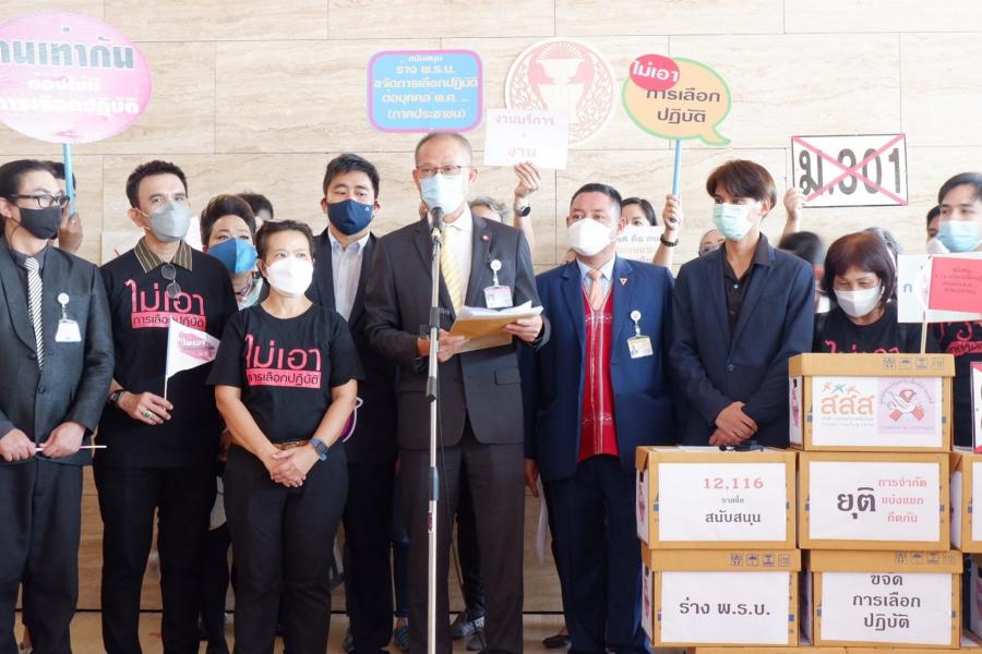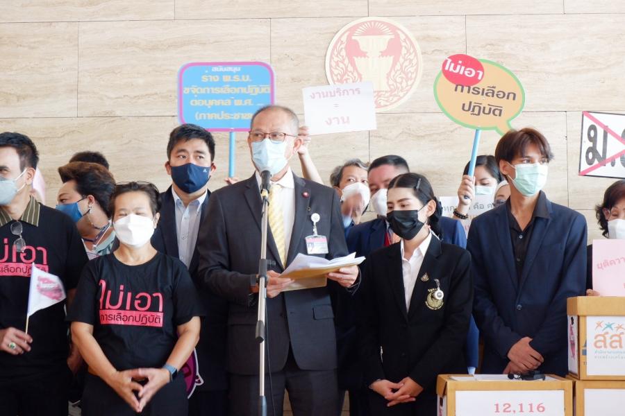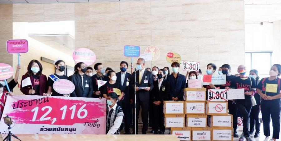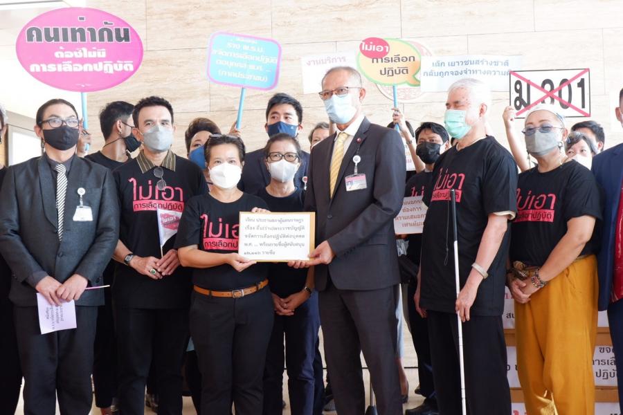 วันพุธที่ 24 พฤศจิกายน 2564 เวลา 10.00 นาฬิกา ณ จุดรับยื่นหนังสือ ชั้น 1 (โซนกลาง) อาคารรัฐสภา นายสมบูรณ์ อุทัยเวียนกุล เลขานุการประธานสภาผู้แทนราษฎร รับยื่นหนังสือจาก น.ส.สุภัทรา นาคะผิว ผู้อำนวยการมูลนิธิศูนย์คุ้มครองสิทธิด้านเอดส์ พร้อมด้วยเครือข่ายประชาชน 10 เครือข่าย ได้แก่ เครือข่ายคนพิการ เครือข่ายผู้ติดเชื้อเอชไอวี/เอดส์ เครือข่ายความหลากหลายทางเพศ เครือข่ายชาติพันธุ์ เครือข่ายผู้ใช้ยาเสพติด เครือข่ายพนักงานบริการ เครือข่ายเด็กและเยาวชน เครือข่ายผู้หญิง เครือข่ายแรงงาน และเครือข่ายผู้สูงอายุ เพื่อเสนอ ร่าง พ.ร.บ.ขจัดการเลือกปฏิบัติต่อบุคคล พ.ศ. .... (ภาคประชาชน) ตามที่เครือข่ายประชาชนได้ยื่นขอริเริ่มเสนอกฎหมายขจัดการเลือกปฏิบัติต่อบุคคลต่อประธานรัฐสภา เมื่อวันที่ 12 พ.ย. 62 และประธานรัฐสภาได้มีคำวินิจฉัยเมื่อวันที่ 28 พ.ย. 62 ว่าสามารถริเริ่มได้ เนื่องจากเป็นกฎหมายตามหมวด 3 แห่งรัฐธรรมนูญแห่งราชอาณาจักรไทย พ.ศ. 2560 และให้ดำเนินการรวบรวมรายชื่อผู้สนับสนุนกฎหมายต่อไป โดยในวันนี้ (24 พ.ย. 64) เครือข่ายประชาชนจึงร่วมกันยื่นรายชื่อ 12,116 รายชื่อ เพื่อสนับสนุนร่าง พ.ร.บ. ดังกล่าว