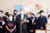 นายสมบูรณ์ อุทัยเวียนกุล เลขานุการประธานสภาผู้แทนราษฎร รับยื่นหนังสือจาก น.ส.สุภัทรา นาคะผิว ผู้อำนวยการมูลนิธิศูนย์คุ้มครองสิทธิด้านเอดส์ พร้อมด้วยเครือข่ายประชาชน 10 เครือข่าย