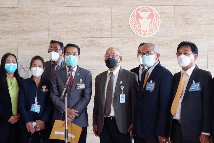 นายสุทิน คลังแสง ประธานกรรมการประสานงานพรรคการเมืองฝ่ายค้านในสภาผู้แทนราษฎร รับยื่นหนังสือจาก นายณรงค์ ซุ้มทอง นายกสมาคมคลองไทย 5 จังหวัดภาคใต้ และคณะ