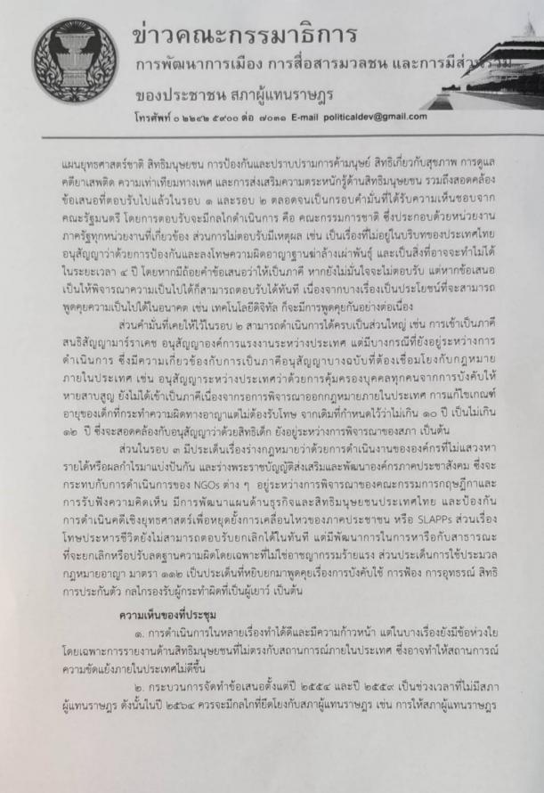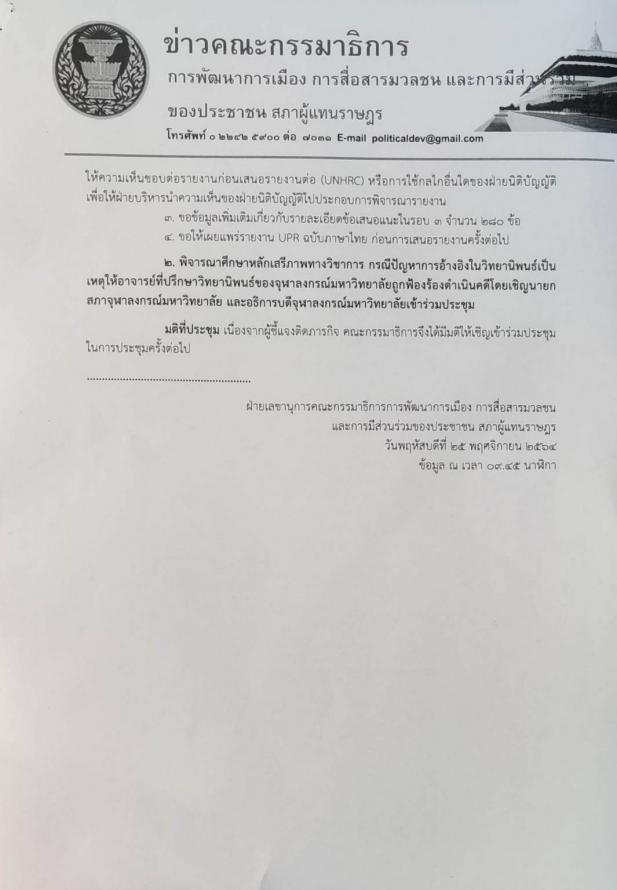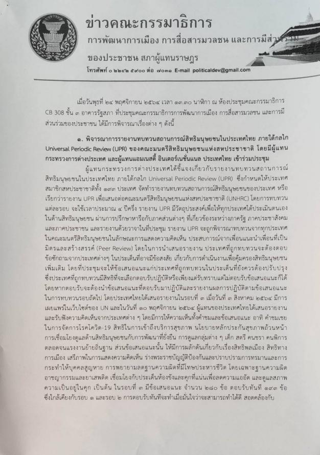 วันพฤหัสบดีที่ 25 พฤศจิกายน 2564 เวลา 11.00 นาฬิกา ณ ห้องแถลงข่าว ชั้น 1 อาคารรัฐสภา น.ส.สุทธวรรณ สุบรรณ ณ อยุธยา โฆษกคณะ กมธ.การพัฒนาการเมือง การสื่อสารมวลชน และการมีส่วนร่วมของประชาชน แถลงข่าวเกี่ยวกับผลการประชุมคณะ กมธ. เมื่อวานนี้ (24 พ.ย. 64) ว่า คณะ กมธ. ได้พิจารณารายงานทบทวนสถานการณ์สิทธิมนุษยชนในประเทศไทย ภายใต้กลไก Universal Periodic Review (UPR) ของคณะมนตรีสิทธิมนุษยชนแห่งสหประชาชาชาติ โดยมีผู้แทนกระทรวงการต่างประเทศ และผู้แทนแอมเนสตี้ อินเตอร์เนชั่นแนล ประเทศไทย เข้าร่วมประชุม ซึ่งผู้แทนกระทรวงการต่างประเทศ ได้ชี้แจงเกี่ยวกับรายงานทบทวนสถานการณ์สิทธิมนุษยชนในประเทศไทย ภายใต้กลไก Universal Periodic Review (UPR) ที่กำหนดให้ประเทศสมาชิกสหประชาชาติทั้ง 193 ประเทศ จัดทำรายงานทบทวนสถานการณ์สิทธิมนุษยชนของประเทศ หรือเรียกว่ารายงาน UPR เพื่อเสนอต่อคณะมนตรีสิทธิมนุษยชนแห่งสหประชาชาติ (UNHRC) สำหรับการพิจารณาศึกษาหลักเสรีภาพทางวิชาการ กรณีปัญหาการอ้างอิงในวิทยานิพนธ์เป็นเหตุให้อาจารย์ที่ปรึกษาวิทยานิพนธ์ของจุฬาลงกรณ์มหาวิทยาลัยถูกฟ้องร้องดำเนินคดีนั้น เนื่องจากผู้เข้าร่วมชี้แจงติดภารกิจ ที่ประชุมจึงมีมติให้เชิญเข้าร่วมประชุมในครั้งต่อไป