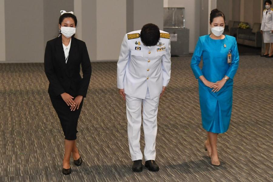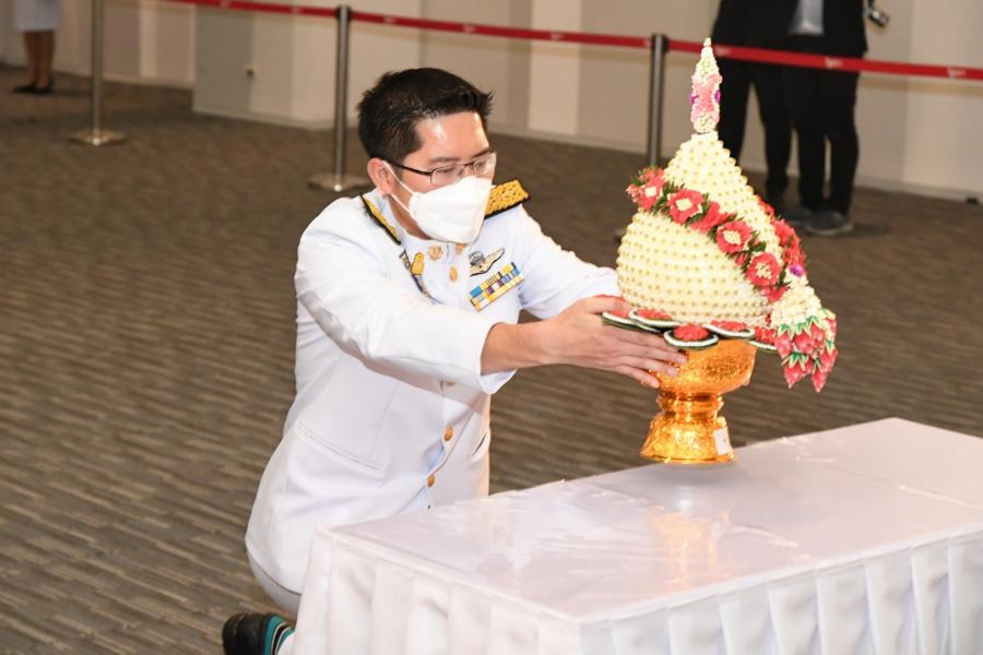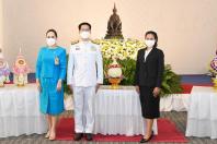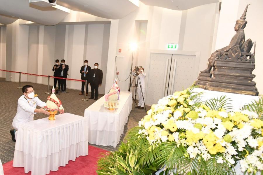 หัวหน้าพรรคไทยศรีวิไลย์ วางพานประดับพุ่มดอกไม้ถวายบังคมพระรูปต้นแบบพระบาทสมเด็จพระปกเกล้าเจ้าอยู่หัว ในนาม พรรคไทยศรีวิไลย์