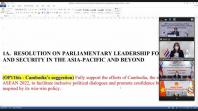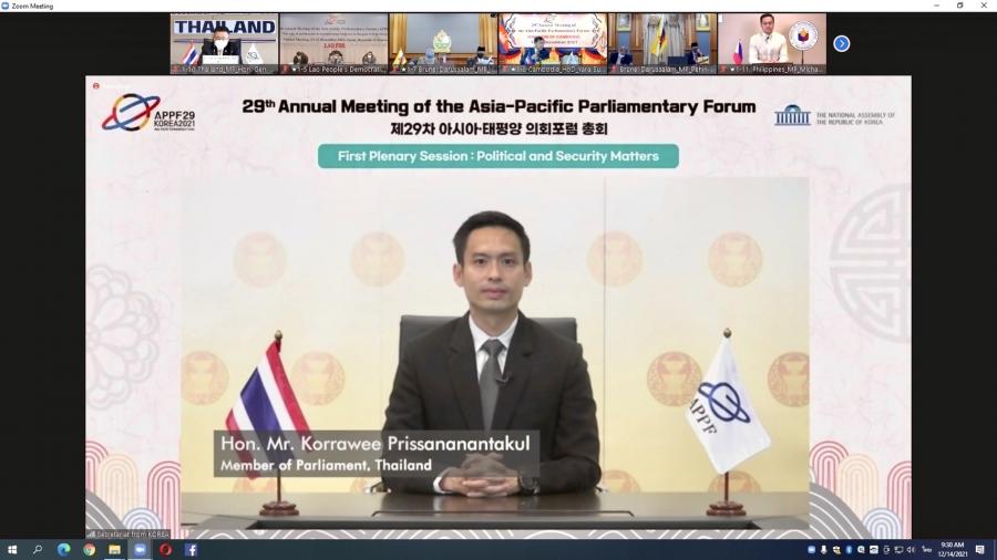ในการประชุมเต็มคณะ วาระที่ 1 ด้านการเมืองและความมั่นคง พลเอก สุรพงษ์ สุวรรณอัตถ์ สมาชิกวุฒิสภา และนายกรวีร์ ปริศนานันทกุล สมาชิกสภาผู้แทนราษฎร ในฐานะผู้แทนรัฐสภาไทย ได้เข้าร่วมการประชุมดังกล่าว ซึ่งผู้แทนฯ ทั้ง 2 คน ได้ร่วมกล่าวถ้อยแถลงต่อที่ประชุมในช่วงดังกล่าวด้วย โดยนายกรวีร์ ปริศนานันทกุล สมาชิกสภาผู้แทนราษฎร ได้กล่าวถ้อยแถลงภายใต้หัวข้อ การเสริมสร้างความเข้มแข็งให้แก่ระบบพหุภาคีของภูมิภาคและการแก้ไขปัญหาตามกฎเกณฑ์ (Strengthening regional multilateralism and addressing issues based on rules) โดยได้กล่าวถึง ระบบพหุภาคีที่ถูกท้าทายจากแนวคิดชาตินิยมและผลประโยชน์แห่งชาติ แต่ด้วยปัญหาปัจจุบันที่มีความซับซ้อนและเป็นประเด็นข้ามชาติ ความร่วมมือระหว่างประเทศ จึงเป็นสิ่งสำคัญในการรักษาสันติภาพและเสถียรภาพในวิกฤติการณ์โรคระบาดโควิด-19 โดยระบบพหุภาคีในอนาคตยังคงต้องการรัฐสภาและสมาชิกรัฐสภาในการเสริมสร้างความเป็นปึกแผ่นและนำนโยบายไปปฏิบัติให้สอดคล้องกับข้อตกลงระหว่างประเทศ ตลอดจนบทบาทของรัฐสภาไทยในการสนับสนุนรัฐบาลในการรักษาไว้ซึ่งการปกครองระหว่างประเทศและระเบียบที่มีกฎกติกาเป็นรากฐาน