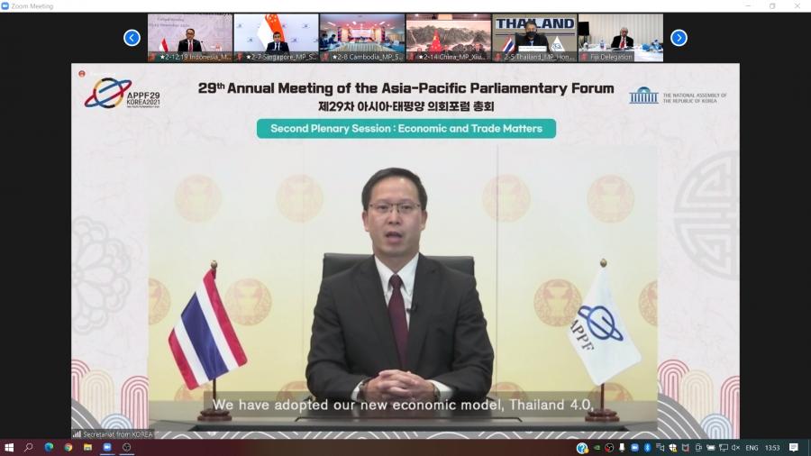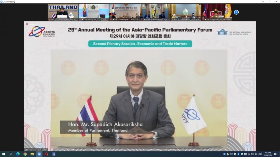 นอกจากนี้ นายสุภดิช อากาศฤกษ์ สมาชิกสภาผู้แทนราษฎร ได้ร่วมกล่าวถ้อยแถลงภายใต้หัวข้อ การเสริมสร้างความร่วมมือระหว่างประเทศเพื่อเพิ่มความยืดหยุ่นทางเศรษฐกิจและการฟื้นตัวของเศรษฐกิจโดยรวม (Strengthening international cooperation for greater economic resilience and inclusive economic recovery) โดยได้กล่าวถึงผลกระทบของการแพร่ระบาดของโรคโควิด-19 ในมิติต่าง ๆ ทั้งสุขภาพ เศรษฐกิจ และการพัฒนาในทุกระดับ ความพยายามที่จะจัดการกับผลกระทบจากการแพร่ระบาดทั้งในด้านสาธารณสุขและเศรษฐกิจ รวมทั้งส่งเสริมอุตสาหกรรมสีเขียวและการพัฒนาเศรษฐกิจแบบ BCG และบทบาทรัฐสภาไทยในการให้ความเห็นชอบพระราชกำหนดหลายฉบับเพื่อบรรเทาผลกระทบจากการระบาดของโรคโควิด-19 และมีคณะกรรมาธิการสามัญของทั้งสองสภาและคณะกรรมาธิการวิสามัญที่เกี่ยวข้องทำหน้าที่พิจารณาและติดตามการใช้เงินกู้และมาตรการต่าง ๆ ของรัฐบาลด้วย โดยเน้นย้ำว่าความร่วมมือระหว่างประเทศและการมีส่วนร่วมของสถาบันพหุภาคีเป็นส่วนสำคัญ โดยรัฐสภาควรใช้บทบาททางด้านนิติบัญญัติติดตามนโยบายและพันธกิจของรัฐเพื่อให้แน่ใจว่าประชาชนและชุมชนได้รับประโยชน์อย่างยั่งยืน