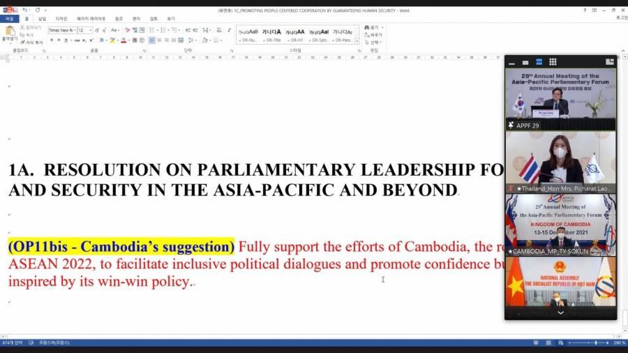 สำหรับการประชุมคณะกรรมาธิการยกร่างข้อมติและแถลงการณ์ร่วมของการประชุม APPF ครั้งที่ 29 นางพิชชารัตน์ เลาหพงศ์ชนะ สมาชิกสภาผู้แทนราษฎร ในฐานะผู้แทนรัฐสภาไทย ได้เข้าร่วมการประชุมดังกล่าว โดยมีนาย Hong Ihk-Pyo สมาชิกรัฐสภาสาธารณรัฐเกาหลีเป็นประธานการประชุม และมีสมาชิกเข้าร่วมประชุม จำนวน 8 ประเทศ โดยที่ประชุมร่วมกันพิจารณาและรับรองร่างข้อมติ จำนวน 13 ร่างข้อมติ ซึ่งร่างข้อมติดังกล่าวได้ผ่านการพิจารณาจากคณะทำงานและการประชุมคณะกรรมาธิการยกร่างข้อมติฯ ก่อนหน้านี้แล้ว ทั้งหมด 3 ครั้ง