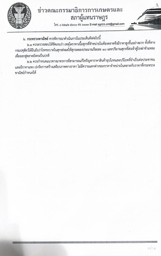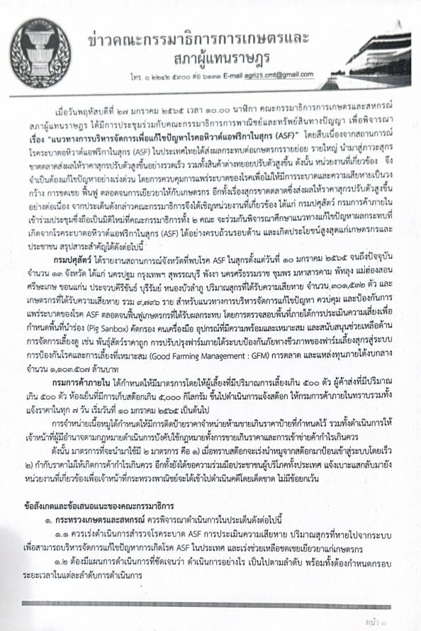 วันพฤหัสบดีที่ 27 มกราคม 2565 เวลา 12.50 นาฬิกา ณ ห้องแถลงข่าว ชั้น 1 อาคารรัฐสภา นายเอกชัย ทรงอำนาจเจริญ โฆษกคณะ กมธ.การเกษตรและสหกรณ์ พร้อมด้วยนายทศพร ทองศิริ โฆษกคณะ กมธ.การพาณิชย์และทรัพย์สินทางปัญญา แถลงข่าวภายหลังการประชุมร่วมกันระหว่างคณะ กมธ.การเกษตรและสหกรณ์กับคณะ กมธ.การพาณิชย์และทรัพย์สินทางปัญญา เพื่อพิจารณาแนวทางการบริหารจัดการเพื่อแก้ไขปัญหาโรคอหิวาต์แอฟริกาในสุกร (ASF) สืบเนื่องจากสถานการณ์โรคระบาดอหิวาต์แอฟริกาในสุกร (ASF) ในประเทศไทย ได้ส่งผลกระทบต่อเกษตรกรรายย่อย และรายใหญ่ นำมาสู่ภาวะสุกรขาดตลาดส่ งผลให้ราคาสุกรปรับตัวสูงขึ้นอย่างรวดเร็ว รวมทั้งสินค้าต่างทยอยปรับตัวสูงขึ้น ดังนั้น หน่วยงานที่เกี่ยวข้อง จึงจำเป็นต้องแก้ไขปัญหาอย่างเร่งด่วน โดยการควบคุมการแพร่ระบาดของโรคเพื่อไม่ให้มีการระบาดและสร้างความเสียหายเป็นวงกว้าง การชดเชย ฟื้นฟู ตลอดจนการเยียวยาให้กับเกษตรกร อีกทั้งเรื่องสุกรขาดตลาดซึ่งส่งผลให้ราคาสุกรปรับตัวสูงขึ้นอย่างต่อเนื่อง จากประเด็นดังกล่าวคณะ กมธ. จึงได้เชิญหน่วยงานที่เกี่ยวข้อง ได้แก่ กรมปศุสัตว์ และกรมการค้าภายใน เข้าร่วมประชุม ซึ่งถือเป็นมิติใหม่ที่คณะ กมธ. ทั้งสองคณะ ได้ร่วมกันพิจารณาศึกษาแนวทางแก้ไขปัญหาผลกระทบที่จากโรคระบาดอหิวาต์แอฟริกาในสุกร (ASF) ได้อย่างครบถ้วน รอบด้าน และเกิดประโยชน์สูงสุดแก่ประชาชน (รายละเอียดตามเอกสารที่แนบ)