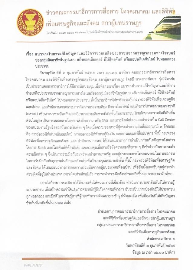 วันพฤหัสบดีที่ 3 กุมภาพันธ์ 2565 เวลา 11.50 นาฬิกา ณ ห้องแถลงข่าว ชั้น 1 อาคารรัฐสภา นายสมเกียรติ ถนอมสินธุ์ โฆษกคณะ กมธ.การสื่อสาร โทรคมนาคม ดิจิทัลเพื่อเศรษฐกิจและสังคม แถลงข่าวผลการประชุมคณะกรรมาธิการ ซึ่งได้มีการพิจารณาแนวทางในการแก้ไขปัญหาและวิธีการช่วยเหลือประชาชนจากอาชญากรรมทางไซเบอร์ของกลุ่มมิจฉาชีพในรูปแบบ แก๊งคอลเซ็นเตอร์ ที่ใช้โทรศัพท์ หรือแอปพลิเคชันไลน์ ไปหลอกลวงประชาชน ซึ่งกรรมาธิการได้หารือร่วมกับกระทรวงดิจิทัลเพื่อเศรษฐกิจและสังคม และสำนักงานคณะกรรมการกิจการกระจายเสียง กิจการโทรทัศน์ และกิจการโทรคมนาคมแห่งชาติ (กสทช.) เพื่อหาแนวทางป้องกันและเยียวยาความเสียหายที่เกิดขึ้นกับประชาชน โดยลักษณะความผิดที่เกินขึ้น ส่วนใหญ่จะเป็นการหลอกลวงโดยการส่งข้อความ หรือ SMS และการติดต่อโดยแอบอ้างว่าเป็น Call Center ของหน่วยงานรัฐหรือสถาบันการเงิน ต่าง ๆ