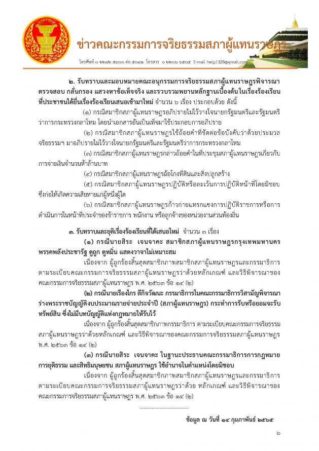 วันจันทร์ที่ 14 กุมภาพันธ์ 2565 เวลา 09.00 นาฬิกา ณ ห้องประชุม CA 408 ชั้น 4 อาคารรัฐสภา นายชวน หลีกภัย ประธานสภาผู้แทนราษฎร เป็นประธานการประชุมคณะกรรมการจริยธรรมสภาผู้แทนราษฎร ครั้งที่ 1/2565 โดยมี นายชลน่าน ศรีแก้ว ผู้นำฝ่ายค้านในสภาผู้แทนราษฎร เข้าร่วมประชุม เพื่อพิจารณารายงานเสนอความเห็นของคณะอนุกรรมการจริยธรรมสภาผู้แทนราษฎรในการตรวจสอบ กลั่นกรอง แสวงหาข้อเท็จจริงและรวบรวมพยานหลักฐานเบื้องต้นในเรื่องร้องเรียน และรับทราบเรื่องร้องเรียนที่มีการเสนอใหม่ (รายละเอียดตามเอกสารที่แนบ)