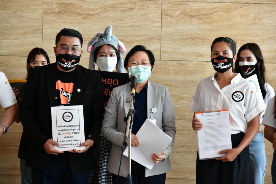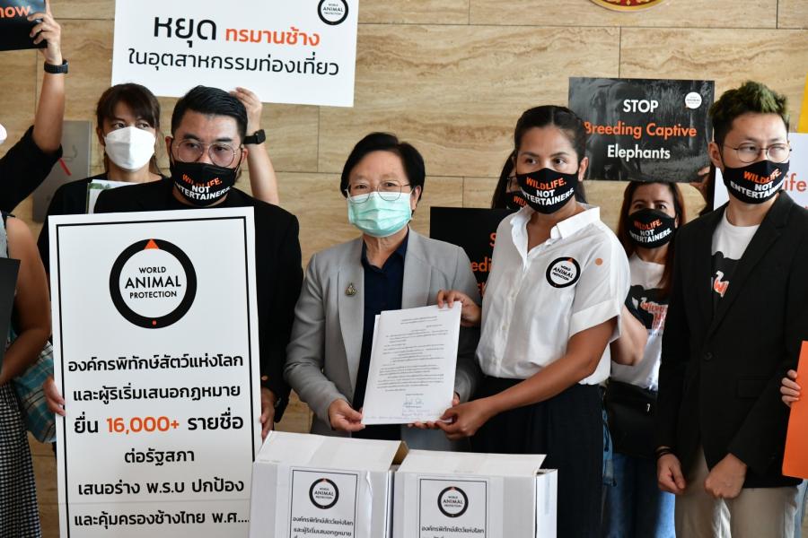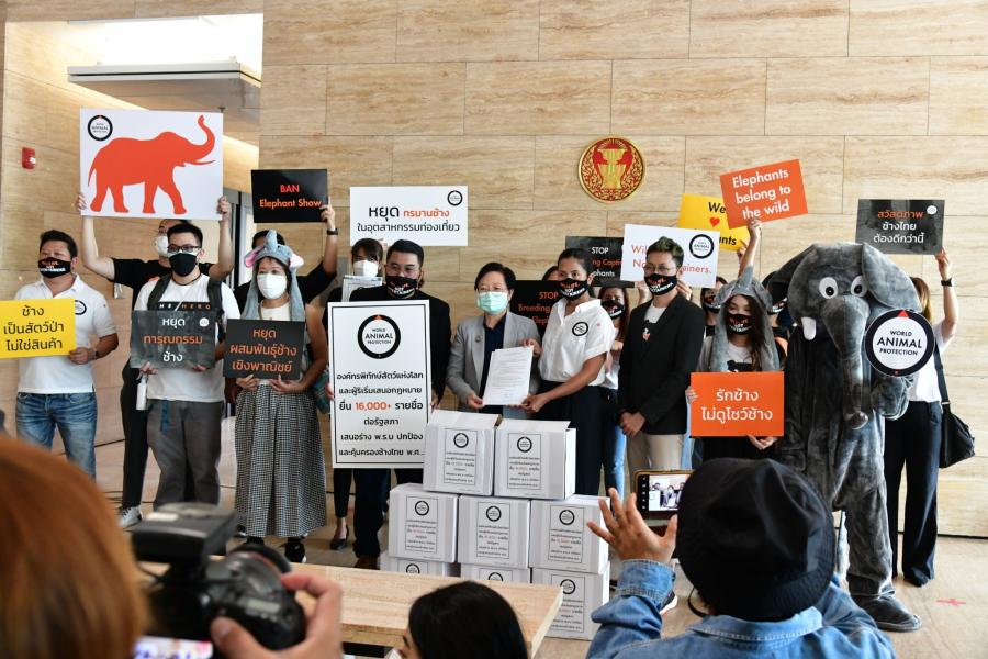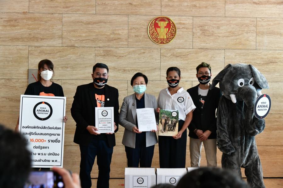 วันศุกร์ที่ 25 กุมภาพันธ์ 2565 เวลา 11.00 นาฬิกา ณ จุดรับยื่นหนังสือ ชั้น 1 (โซนกลาง) อาคารรัฐสภา น.ส.ผ่องศรี ธาราภูมิ คณะทำงานทางการเมืองของประธานสภาผู้แทนราษฎร รับยื่นหนังสือจาก น.ส.โรจนา สังข์ทอง ผู้อำนวยการองค์กรพิทักษ์สัตว์แห่งโลก เพื่อขอเสนอร่างพระราชบัญญัติปกป้องคุ้มครองช้างไทย พ.ศ. .... พร้อมเอกสารลงรายมือชื่อของผู้มีสิทธิเลือกตั้ง จำนวน 16,495 รายชื่อ สำหรับร่างดังกล่าวมีหลักการและเหตุผลเพื่อปกป้องและคุ้มครองช้างไทย เนื่องด้วยปัจจุบันสถานการณ์ด้านช้างเลี้ยงในประเทศไทยกำลังวิกฤตในขณะที่การนำช้างมาเลี้ยงหรือการเพาะพันธุ์ช้างในเชิงพาณิชย์โดยไม่คำนึงถึงการอนุรักษ์ช้างอย่างยั่งยืนและการฝึกช้างที่ทรมานการแยกลูกช้าง ออกมาฝึกอย่างทรมานรวมทั้งการใช้วิธีการที่ทารุณที่ขัดกับหลักพฤติกรรมของการฝึกช้าง ขัดกับหลักพฤติกรรมตามธรรมชาติ รวมทั้งสภาพแวดล้อมที่อยู่ของช้างที่ไม่เหมาะสม ภาวะความหิวโหยการใช้แรงงานหนักและการขาดอิสรภาพตามพฤติกรรมธรรมชาตินำมาซึ่งความทรมานของช้างไทย นอกจากนี้ยังมีการส่งออกช้างออกนอกราชอาณาจักรเป็นเพียงสินค้าอันเป็นการละเมิดอนุสัญญาว่าด้วยการค้าระหว่างประเทศซึ่งชนิดสัตว์ป่าและพืชป่าที่ใกล้สูญพันธุ์หรือไซเตส (CITES) ประเทศไทยในฐานะภาคีอนุสัญญาดังกล่าว จึงควรกำหนดมาตรการทางกฎหมายในการคุ้มครองปกป้องช้างไทยไม่ให้ได้รับความทรมานและไม่ให้เกิดการทารุณกรรมช้างไทย การลักลอบค้าชิ้นส่วนของช้างประกอบกับพระราชบัญญัติสำหรับรักษาช้างป่า พ.ศ. 2464 ใช้บังคับมาเป็นเวลานานและไม่เหมาะสมและสอดคล้องกับสถานการณ์ปัจจุบัน