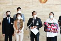 นายณัฐชา บุญไชยอินสวัสดิ์ ประธานคณะ กมธ.การพัฒนาการเมือง การสื่อสารมวลชน และการมีส่วนร่วมของประชาชน และคณะ รับยื่นหนังสือจาก น.ส.เพลง ทัพมาลัย นายกองค์การบริหารนิสิตมหาวิทยาลัยเกษตรศาสตร์และคณะ