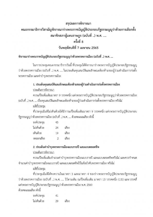 วันพฤหัสบดีที่ 7 เมษายน 2565 เวลา 13.10 นาฬิกา ณ ห้องแถลงข่าว ชั้น 1 อาคารรัฐสภา รศ.รงค์ บุญสวยขวัญ และนายอัครเดช วงษ์พิทักษ์โรจน์ โฆษก คณะ กมธ. วิสามัญพิจารณาร่าง พ.ร.ป. ว่าด้วยการเลือกตั้งสมาชิกสภาผู้แทนราษฎร (ฉบับที่ .. ) พ.ศ. .... แถลงผลการประชุมคณะ กมธ. ครั้งที่ 8 ซึ่งที่ประชุมพิจารณา 2 ประเด็น ได้แก่ 1. คุณสมบัติและลักษณะต้องห้ามของผู้ร่วมดำเนินการก่อตั้งพรรคการเมือง 2. ค่าบำรุงพรรคการเมืองแบบรายปี และแบบตลอดชีพ