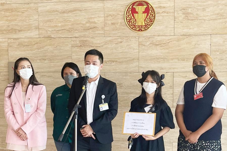 นายปดิพัทธ์ สันติภาดา รองประธานคณะ กมธ.การพัฒนาการเมือง การสื่อสารมวลชน และการมีส่วนร่วมของประชาชน คนที่สอง รับยื่นหนังสือจาก น.ส.ศุภมาศ กัญญาภัคโภคิน ทนายความจากภาคีนักกฎหมายสิทธิมนุษยชน ซึ่งนำเยาวชนมาร้องเรียนต่อคณะ กมธ. เพื่อขอให้ตรวจสอบข้อเท็จจริงกรณีเจ้าหน้าที่รัฐ ติดตามคุกคามนักกิจกรรมและเยาวชน
