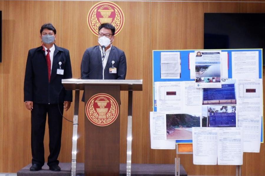 นายประเสริฐพงษ์ ศรนุวัตร์ และนายกัญจน์พงศ์ จงสุทธนามณี ส.ส.พรรคก้าวไกล แถลงข่าวกรณีรายงานการศึกษาผลกระทบสิ่งแวดล้อมเบื้องต้น (IEE) โครงการเขื่อนป้องกันตลิ่งริมทะเล หาดแม่รำพึง จ.ประจวบคีรีขันธ์ ของกรมโยธาธิการและผังเมือง
