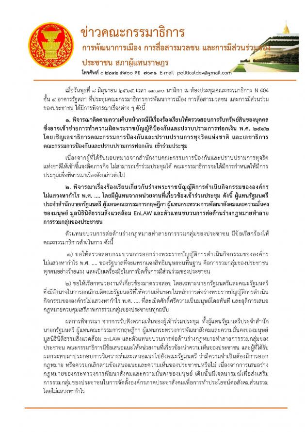วันพฤหัสบดีที่ 9 มิถุนายน 2565 เวลา 11.00 นาฬิกา ณ ห้องแถลงข่าว ชั้น 1 อาคารรัฐสภา น.ส.สุทธวรรณ สุบรรณ ณ อยุธยาโฆษกคณะ กมธ. การพัฒนาการเมือง การสื่อสารมวลชน และการมีส่วนร่วมของประชาชน แถลงข่าวผลการประชุมว่า เมื่อวันพุธที่ 8 มิ.ย. 65 คณะ กมธ. ได้มีการพิจารณาเรื่องต่าง ๆ ดังนี้ 1. พิจารณาติดตามความคืบหน้ากรณีมีเรื่องร้องเรียนให้ตรวจสอบการรับทรัพย์สินของบุคคลซึ่งอาจเข้าข่ายการทำความผิด พ.ร.บ.ป้องกันและปราบปรามการฟอกเงิน พ.ศ. 2552 โดยเชิญเลขาธิการคณะกรรมการป้องกันและปราบปรามการทุจริตแห่งชาติ และเลขาธิการคณะกรรมการป้องกันและปราบปรามการฟอกเงิน เข้าร่วมประชุม