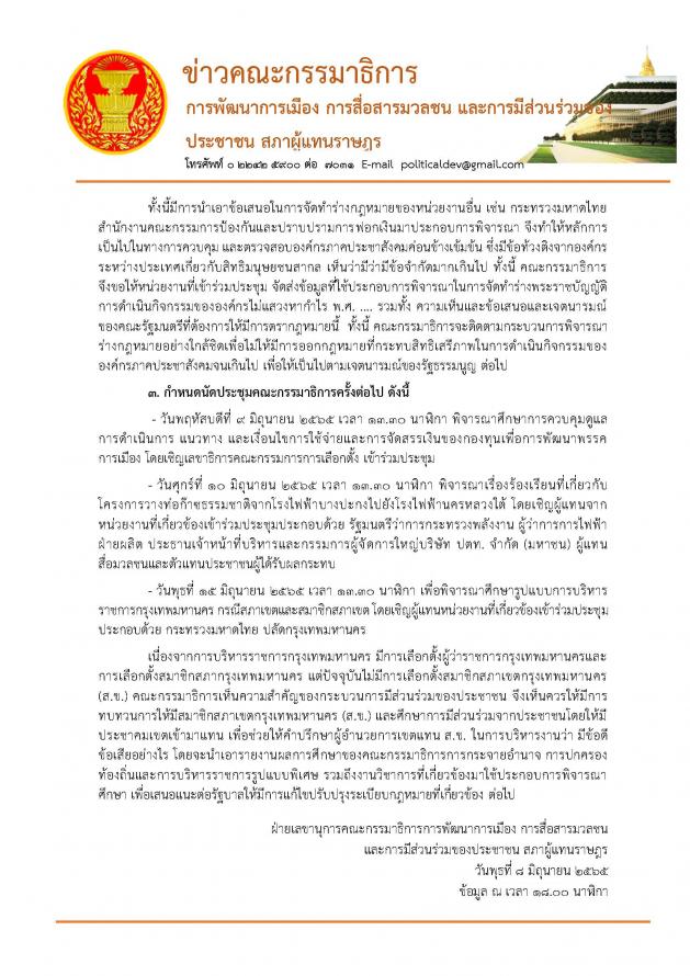 น.ส.สุทธวรรณ สุบรรณ ณ อยุธยาโฆษกคณะ กมธ. การพัฒนาการเมือง การสื่อสารมวลชน และการมีส่วนร่วมของประชาชน แถลงข่าวผลการประชุมว่า เมื่อวันพุธที่ 8 มิ.ย. 65 คณะ กมธ.