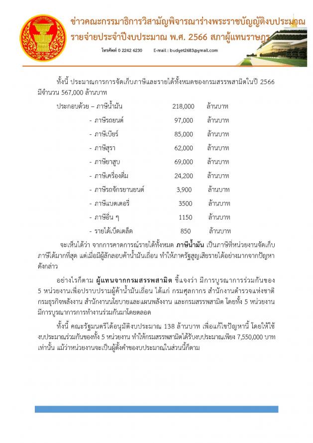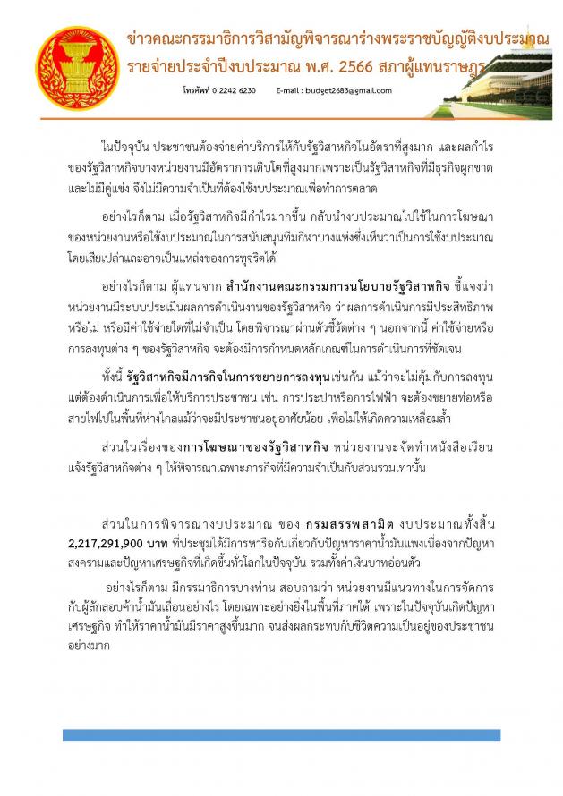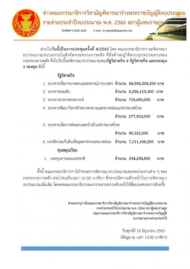 วันศุกร์ที่ 10 มิถุนายน 2565 เวลา 14.40 นาฬิกา ณ ห้องแถลงข่าว ชั้น 1 อาคารรัฐสภา นายบัญญัติ เจตนจันทร์ พร้อมด้วยนายยุทธพงศ์ จรัสเสถียร โฆษกคณะ กมธ.วิสามัญพิจารณาร่างพระราชบัญญัติงบประมาณรายจ่ายประจำปีงบประมาณ พ.ศ. 2566 แถลงข่าว ผลการประชุมคณะกมธ. ครั้งที่ 4/2565 เมื่อวันพฤหัสบดีที่ 9 มิ.ย. 65 ว่า คณะกมธ. ได้พิจารณางบประมาณ หน่วยงานในสังกัดกระทรวงการคลังเพิ่มเติม อีก 6 หน่วยงาน 1 แผนงาน ประกอบด้วย