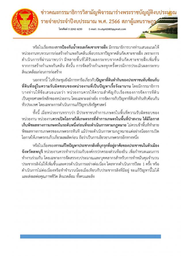 โดย กมธ. ได้มีข้อสังเกตและข้อเสนอแนะให้กับหน่วยงานในหลายประเด็น อาทิ การวางแผนเพื่อแก้ไขปัญหาการจัดการขยะแบบเชิงรุก การปลูกป่า บำรุงรักษาฟื้นฟูพื้นที่ป่าไม้ และการดับไฟป่า การป้องกันน้ำทะเลกัดเซาะชายฝั่ง การแก้ไขปัญหาประชากรลิงบุกรุกที่อยู่อาศัยของประชาชนในตัวเมือง จ.ลพบุรี การแก้ไขปัญหาช้างป่ารุกล้ำเข้าไปในพื้นที่อยู่อาศัยกระพื้นที่ทำการเกษตรของประชาชน