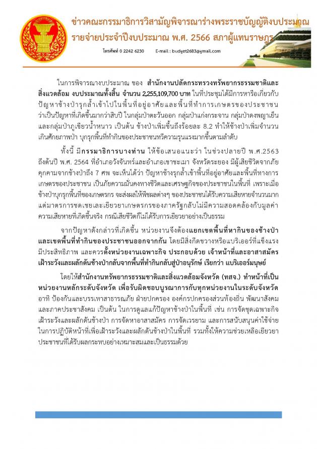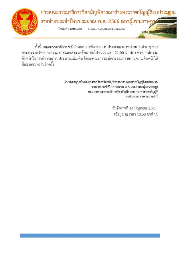 วันอังคารที่ 14 มิถุนายน 2565 เวลา 13.30 นาฬิกา ณ ห้องแถลงข่าว ชั้น 1 อาคารรัฐสภา นายเรืองไกร ลีกิจวัฒนะ นายสัณหพจน์ สุขศรีเมือง นายบัญญัติ เจตนจันทร์ นายณัฏฐ์ชนน ศรีก่อเกื้อ และนางกรณิศ งามสุคนธ์รัตนา โฆษกคณะ กมธ.วิสามัญพิจารณาร่างพระราชบัญญัติงบประมาณรายจ่ายประจำปีงบประมาณ พ.ศ. 2566  แถลงข่าว ผลการประชุมคณะกมธ. โดยคณะ กมธ. ได้ใช้เวลาในได้ใช้เวลาในการพิจารณางบประมาณมาแล้วทั้งหมด ใช้เวลา 4 วัน รวม 34 ชั่วโมง ซึ่งมีหน่วยงานที่ผ่านการพิจารณาไปแล้ว 1 กระทรวง 2 หน่วยงาน  2 กองทุนคิดเป็น 3.7 ของหน่วยงานที่ต้องพิจารณาทั้งหมด โดย เมื่อวานนี้ เป็นการประชุมครั้งที่ 6/2565 วันจันทร์ที่ 13 มิถุนายน 2565 ซึ่งคณะ กมธ. ได้พิจารณางบประมาณ หน่วยงานในสังกัดกระทรวงทรัพยากรธรรมชาติและสิ่งแวดล้อมไปแล้ว จำนวน 2 หน่วยงาน จากทั้งหมด 15 หน่วยงาน งบประมาณทั้งสิ้น 30,638,575,100 บาท ดังนี้