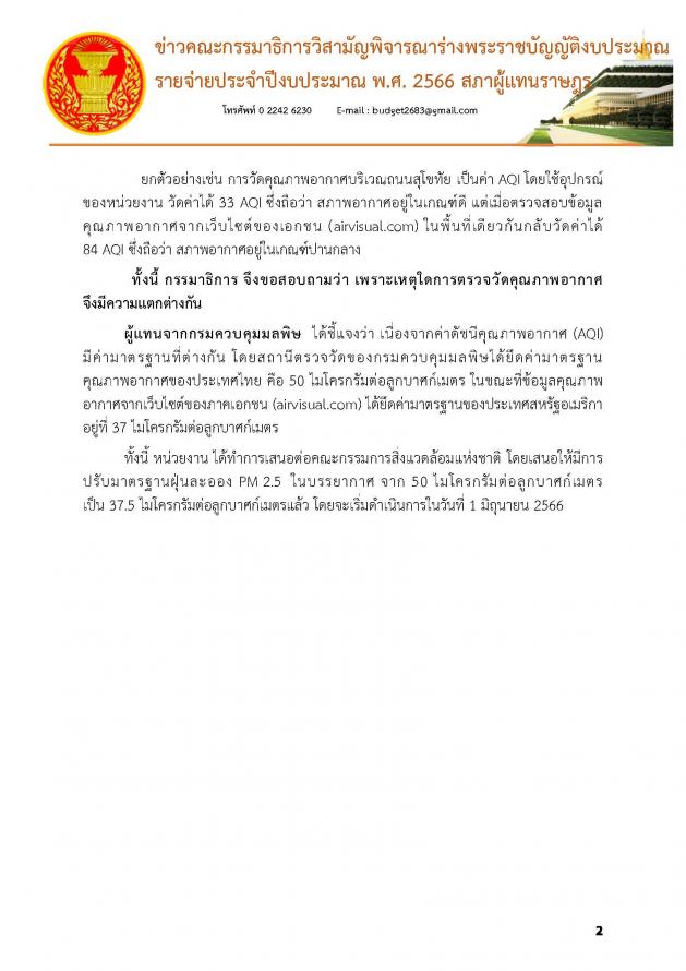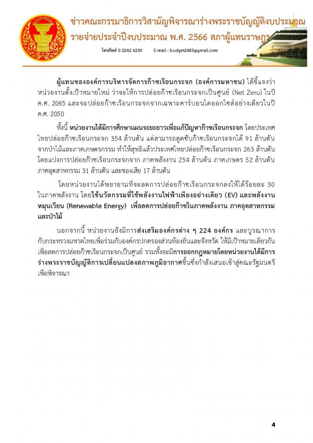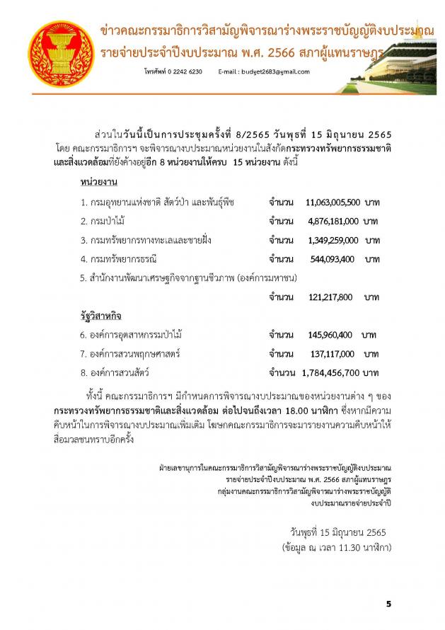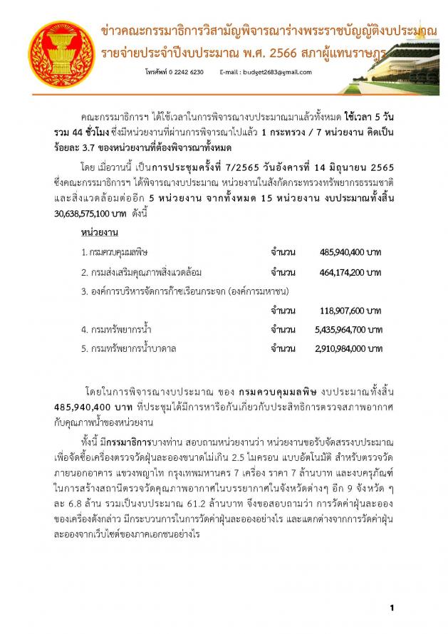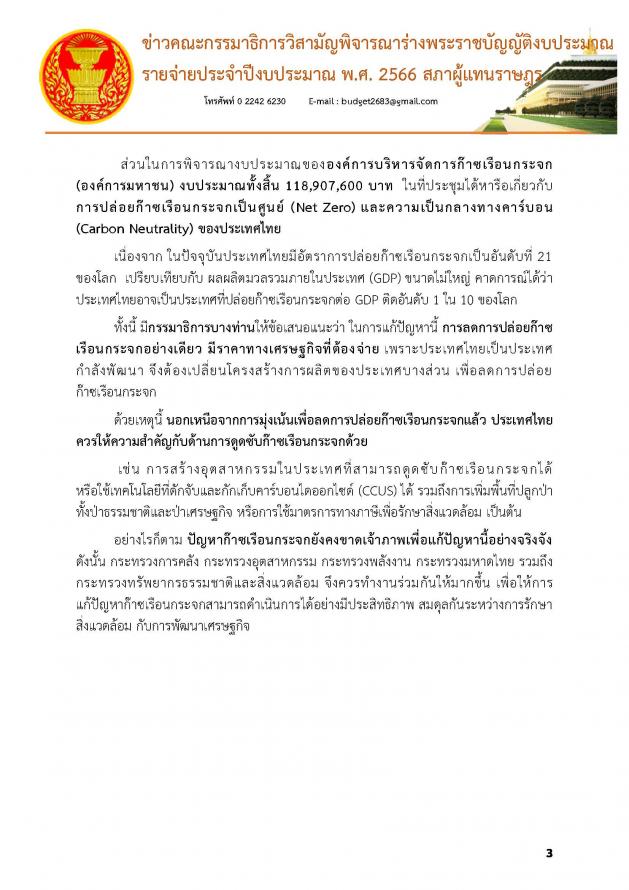 วันพุธที่ 15 มิถุนายน 2565 เวลา 11.30 นาฬิกา ณ ห้องแถลงข่าว ชั้น 1 อาคารรัฐสภา นายเผ่าภูมิ โรจนสกุล โฆษก คณะ กมธ.วิสามัญ พิจารณาร่างพระราชบัญญัติงบประมาณรายจ่ายประจำปีงบประมาณ พ.ศ. 2566 แถลงข่าวผลการประชุมคณะกมธ. ครั้งที่ 7/2565 และครั้งที่ 8/2565 โดยการประชุมครั้งที่ 7/2565 คณะกมธ. ได้พิจารณา งบประมาณในสังกัดกระทรวงทรัพยากรธรรมชาติและสิ่งแวดล้อมต่ออีก 5 หน่วยงาน จากทั้งหมด15 หน่วยงาน งบประมาณทั้งสิ้น 30,638,575,100 บาท ได้แก่ 1. กรมควบคุมมลพิษ 2. กรมส่งเสริมคุณภาพสิ่งแวดล้อม 3. องค์การบริหารจัดการก๊าซเรือนกระจก 4. กรมทรัพยากรน้ำ 5. กรมทรัพยากรน้ำบาดาล โดยกมธ. ให้ข้อเสนอแนะว่า ในการแก้ปัญหาก๊าซเรือนกระจกนี้ การลดการปล่อยก๊าซเรือนกระจกอย่างเดียว มีราคาทางเศรษฐกิจที่ต้องจ่าย เพราะประเทศไทยเป็นประเทศกำลังพัฒนา จึงต้องเปลี่ยนแปลงโครงสร้างการผลิตของประเทศบางส่วน เพื่อลดการปล่อยก๊าซเรือนกระจก ประเทศไทยยังควรให้ความสำคัญกับด้านการดูดซับก๊าซเรือนกระจกด้วย สำหรับการประชุมครั้งที่8/2565 ในวันนี้ (15มิ.ย. 65) คณะ กมธ.ได้พิจารณางบประมาณหน่วยงานในสังกัดกระทรวงทรัพยากรธรรมชาติฯที่ยังค้างอยู่อีก 8หน่วยงาน ได้แก่ 1. กรมอุทยานแห่งชาติ สัตว์ป่า และพันธุ์พืช 2. กรมป่าไม้ 3. กรมทรัพยากรทะเลและชายฝั่ง 4. กรมทรัพยากรธรณี 5. สำนักงานพัฒนาเศรษฐกิจจากฐานชีวภาพ(องค์กรมหาชน)6. องค์การอุตสาหกรรมป่าไม้ 7. องค์การสวนพฤกษศาสตร์ 8. องค์การสวนสัตว์ (รายละเอียดตามเอกสารที่แนบ)