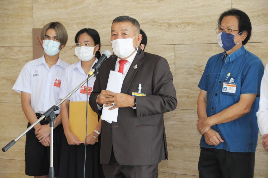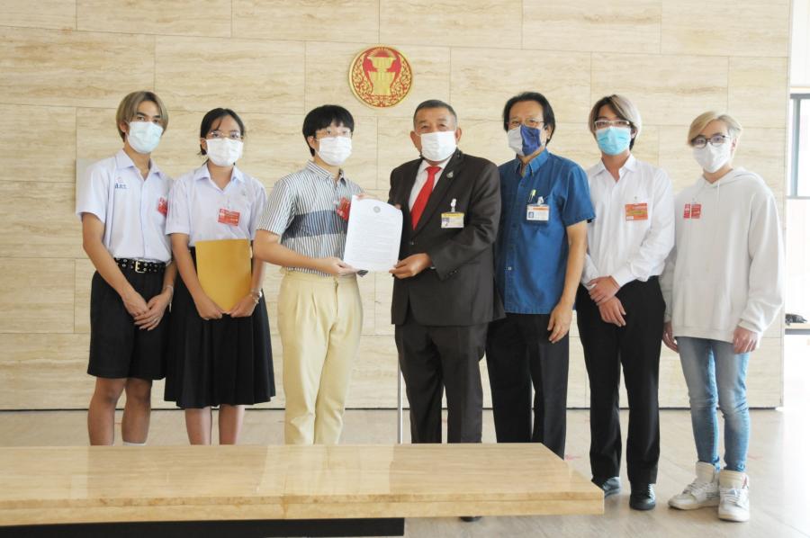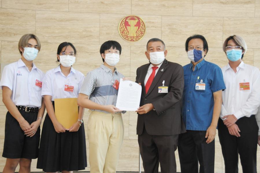 นายครูมานิตย์ สังข์พุ่ม โฆษกคณะ กมธ.การทหาร รับยื่นหนังสือจาก นายชญานนท์ วารีเกษม นักศึกษาวิชาทหาร ชั้นปีที่ 3 โรงเรียนเตรียมอุดมศึกษา