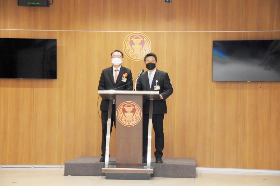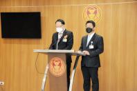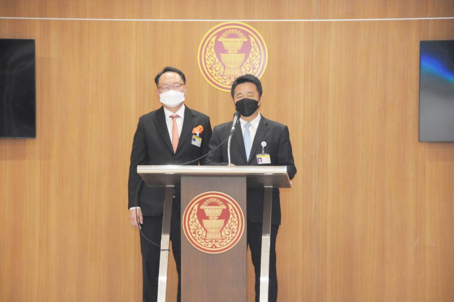 นายยุทธพงศ์ จรัสเสถียร และนายบัญญัติ เจตนจันทร์ โฆษกคณะ กมธ.วิสามัญพิจารณาร่าง พ.ร.บ.งบประมาณรายจ่ายประจำปีงบประมาณ พ.ศ. 2566 แถลงข่าวเกี่ยวกับการประชุมของคณะ กมธ.