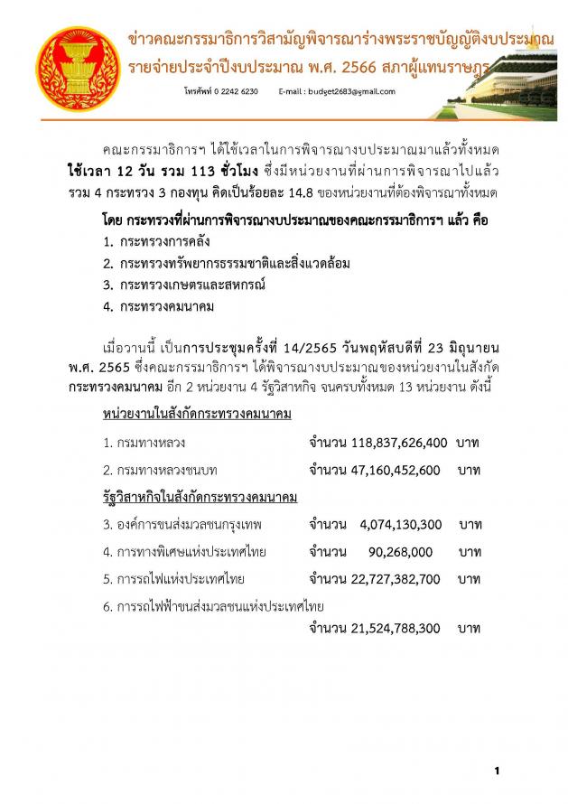 วันศุกร์ที่ 24 มิถุนายน 2565 เวลา 11.30 นาฬิกา ณ ห้องแถลงข่าว ชั้น 1 อาคารรัฐสภา นายยุทธพงศ์ จรัสเสถียร และนายบัญญัติ เจตนจันทร์ โฆษกคณะ กมธ.วิสามัญพิจารณาร่าง พ.ร.บ.งบประมาณรายจ่ายประจำปีงบประมาณ พ.ศ. 2566 แถลงข่าวเกี่ยวกับการประชุมของคณะ กมธ. โดยคณะ กมธ. ได้ใช้เวลาในการพิจารณางบประมาณมาแล้ว 12 วัน รวม 113 ชั่วโมง ซึ่งมีหน่วยงานที่ผ่านการพิจารณาไปแล้ว 4 กระทรวง 3 กองทุน คิดเป็นร้อยละ 14.8 ของหน่วยงานที่ต้องพิจารณาทั้งหมด โดยกระทรวงที่ผ่านการพิจารณางบประมาณของคณะ กมธ. แล้ว ได้แก่ กระทรวงการคลัง กระทรวงทรัพยากรธรรมชาติและสิ่งแวดล้อม กระทรวงเกษตรและสหกรณ์ และกระทรวงคมนาคม ซึ่งเมื่อวานนี้ (23 มิ.ย. 65) เป็นการประชุมครั้งที่ 14/2565 โดยคณะ กมธ. ได้พิจารณางบประมาณของหน่วยงานในสังกัดกระทรวงคมนาคม อีก 2 หน่วยงาน 4 รัฐวิสาหกิจ จนครบทั้งหมด 13 หน่วยงาน นอกจากนี้ ที่ประชุมยังได้แต่งตั้งคณะอนุ กมธ. จำนวน 9 คณะ ประกอบด้วย
