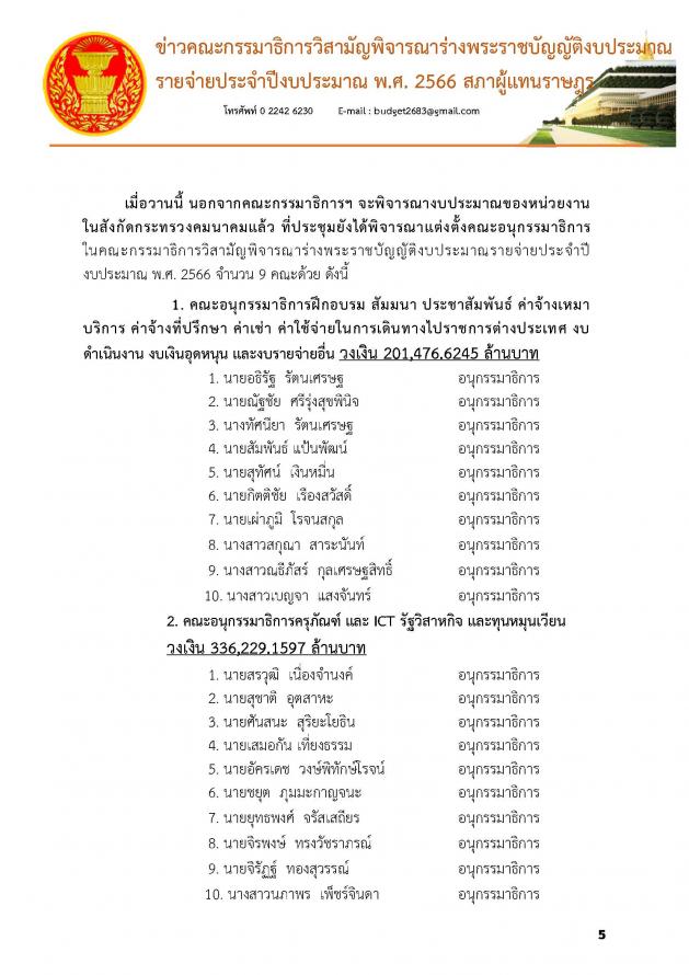 1. คณะอนุ กมธ.ฝึกอบรม สัมมนา ประชาสัมพันธ์ ค่าจ้างเหมาบริการ ค่าจ้างที่ปรึกษา ค่าเช่า ค่าใช้จ่ายในการเดินทางไปราชการต่างประเทศ งบดำเนินงาน งบเงินอุดหนุน และงบรายจ่ายอื่น วงเงิน 201,476.6245 ล้านบาท