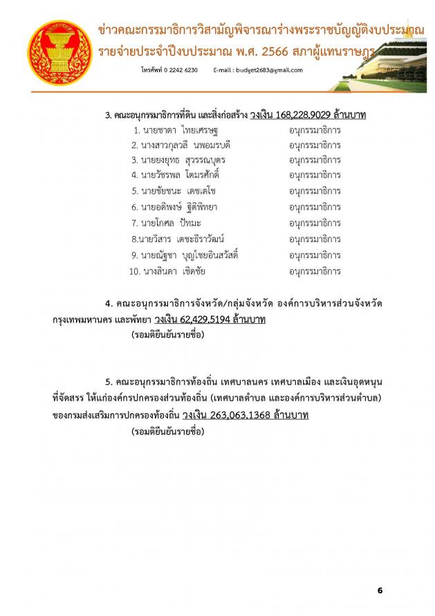 5.คณะอนุ กมธ.ท้องถิ่น เทศบาลนคร เทศบาลเมือง และเงินอุดหนุนที่จัดสรรให้แก่องค์กรปกครองส่วนท้องถิ่น (เทศบาลตำบลและองค์การบริหารส่วนตำบล) ของกรมส่งเสริมการปกครองท้องถิ่น วงเงิน 263,063.1368 ล้านบาท