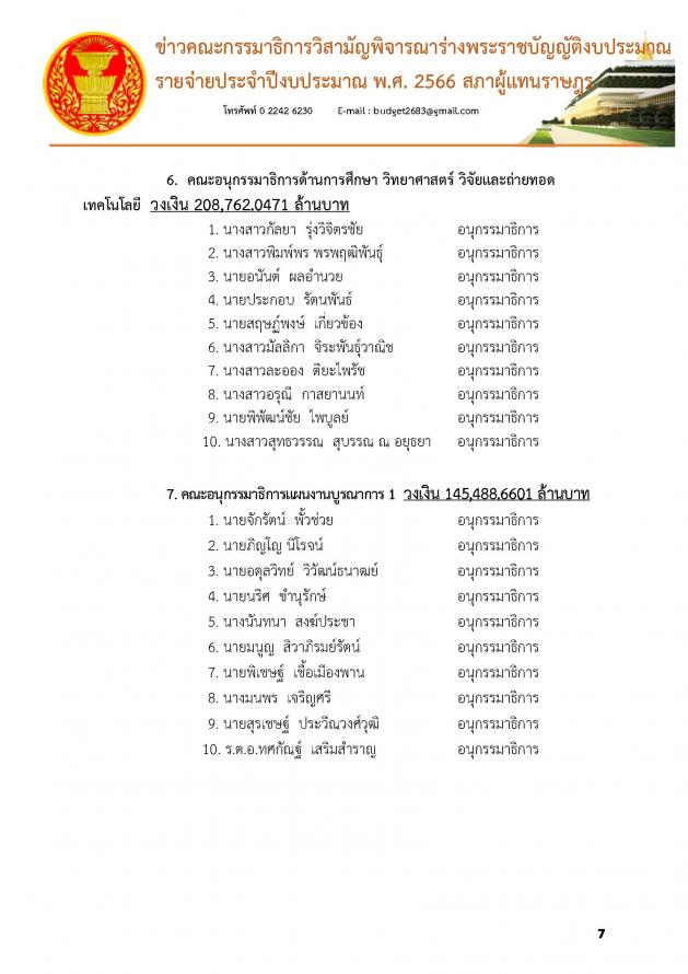 6.คณะอนุ กมธ.ด้านการศึกษา วิทยาศาสตร์ วิจัยและถ่ายทอดเทคโนโลยี วงเงิน 208,762.0471 ล้านบาท