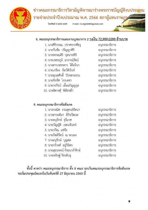 ทั้งนี้ คาดว่า คณะอนุ กมธ. ทั้ง 8 คณะ ยกเว้นคณะอนุ กมธ.ข้อสังเกต จะเริ่มประชุมนัดแรกในวันจันทร์ที่ 27 มิ.ย. 65